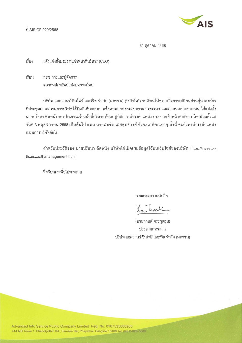 ผู้สื่อข่าวรายงานว่า วันที่ 31 ตุลาคม 2568 บริษัท แอดวานซ์ อินโฟร์ เซอร์วิส จำกัด (มหาชน) (AIS) แจ้งแต่งตั้งประธานเจ้าหน้าที่บริหาร (CEO) ต่อ ตลาดหลักทรัพย์แห่งประเทศไทย ทราบถึงการเปลี่ยนผ่านผู้นำองค์กร ที่ประชุมคณะกรรมการบริษัทได้มีมติเห็นชอบตามข้อเสนอของคณะกรรมการสรรหา และกำหนดค่าตอบแทนให้แต่งตั้ง นายปรัธนา ลีลพนัง รองประธานเจ้าหน้าที่บริหาร ด้านปฏิบัติการ ดำรงตำแหน่ง ประธานเจ้าหน้าที่บริหาร โดยมีผลตั้งแต่ วันที่ 3 พฤศจิกายน 2568 เป็นต้นไป แทน นายสมชัย เลิศสุทธิวงค์ ซึ่งจะเกษียณอายุ ทั้งนี้จะยังคงดำรงตำแหน่ง กรรมการบริษัทต่อไป