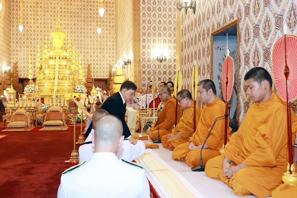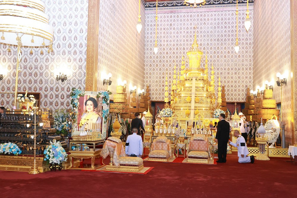 พระบาทสมเด็จพระเจ้าอยู่หัว เสด็จพระราชดำเนินไปทรงทอดผ้าไตรพระราชาคณะ 1 รูปที่ถวายอดิเรก และพระพิธีธรรมสวดพระอภิธรรม 8 รูป พระสงฆ์สดับปกรณ์ พระบาทสมเด็จพระเจ้าอยู่หัว และสมเด็จพระนางเจ้า ฯ พระบรมราชินี ทรงหลั่งทักษิโณทก พระสงฆ์ถวายอนุโมทนา ถวายอดิเรก ถวายพระพรลา จากนั้น พระบาทสมเด็จพระเจ้าอยู่หัว เสด็จพระราชดำเนินไปทรงกราบที่หน้าเครื่องนมัสการหน้าพระแท่นพระนพปฏลมหาเศวตฉัตร เสร็จแล้ว พระบาทสมเด็จพระเจ้าอยู่หัว และสมเด็จพระนางเจ้า ฯ พระบรมราชินี เสด็จพระราชดำเนินไปทรงกราบที่หน้าพระโกศ ทรงรับการถวายความเคารพ ของผู้มาเฝ้าทูลละอองธุลีพระบาท แล้วเสด็จลงจากพระที่นั่งดุสิตมหาปราสาท ไปประทับรถยนต์พระที่นั่ง เสด็จพระราชดำเนินกลับ