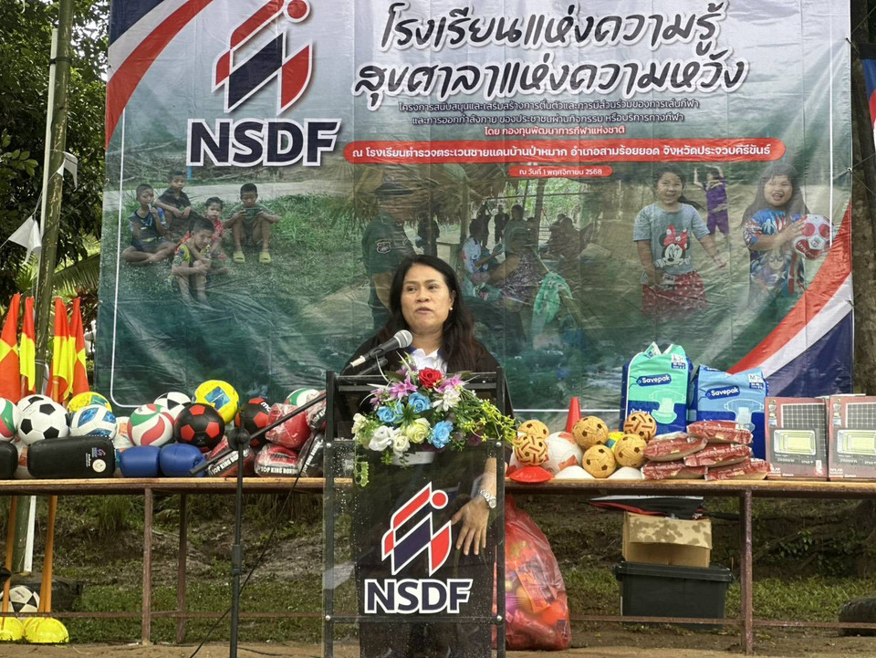 วันที่ 1 พฤศจิกายน 2568 ที่ศูนย์การเรียนตำรวจตระเวนชายแดนบ้านป่าหมาก ตำบลศาลาลัย อำเภอสามร้อยยอด จังหวัดประจวบคีรีขันธ์ พล.ต.ท.รุ่งโรจน์ ฐากูรปุณยสิริ ผู้บัญชาการตำรวจตระเวนชายแดน พร้อมด้วย นางสาวภิม นครศรี หัวหน้างานส่วนกองทุนกีฬา ซึ่งเป็นตัวแทน นายทนุเกียรติ จันทร์ชุม ผจก.กองทุนพัฒนาการกีฬาแห่งชาติ พล.ต.ต.จักรเพชร เพชรพลอยนิล ผบก.ตชด.ภาค 1 พ.ต.อ.อัคราวัส สีห์ธน บุญอุบล ผกก.ตชด.ที่ 14 คณะครู นักเรียน และผู้นำชุมชน ร่วมกันส่งมอบสนามกีฬา และไฟส่องสว่าง อุปกรณ์กีฬา อุปกรณ์การแพทย์ ภายใต้ชื่อ “โรงเรียนแห่งความรู้ สุขศาลาแห่งความหวัง“ โดยก่อนพิธี ตัวแทนเด็กนักเรียน ศูนย์การเรียนตำรวจตระเวนชายแดนบ้านป่าหมาก ได้กล่าวแสดงความไว้อาลัย สมเด็จพระนางเจ้าสิริกิติ์ พระบรมราชินีนาถ พระบรมราชชนนีพันปีหลวง เสด็จสู่สวรรคาลัย ด้วยสำนึกในพระมหากรุณาธิคุณอันหาที่สุดมิได้ “ธ สถิตในดวงใจไทยนิรันดร์” พร้อมยืนสงบนิ่ง