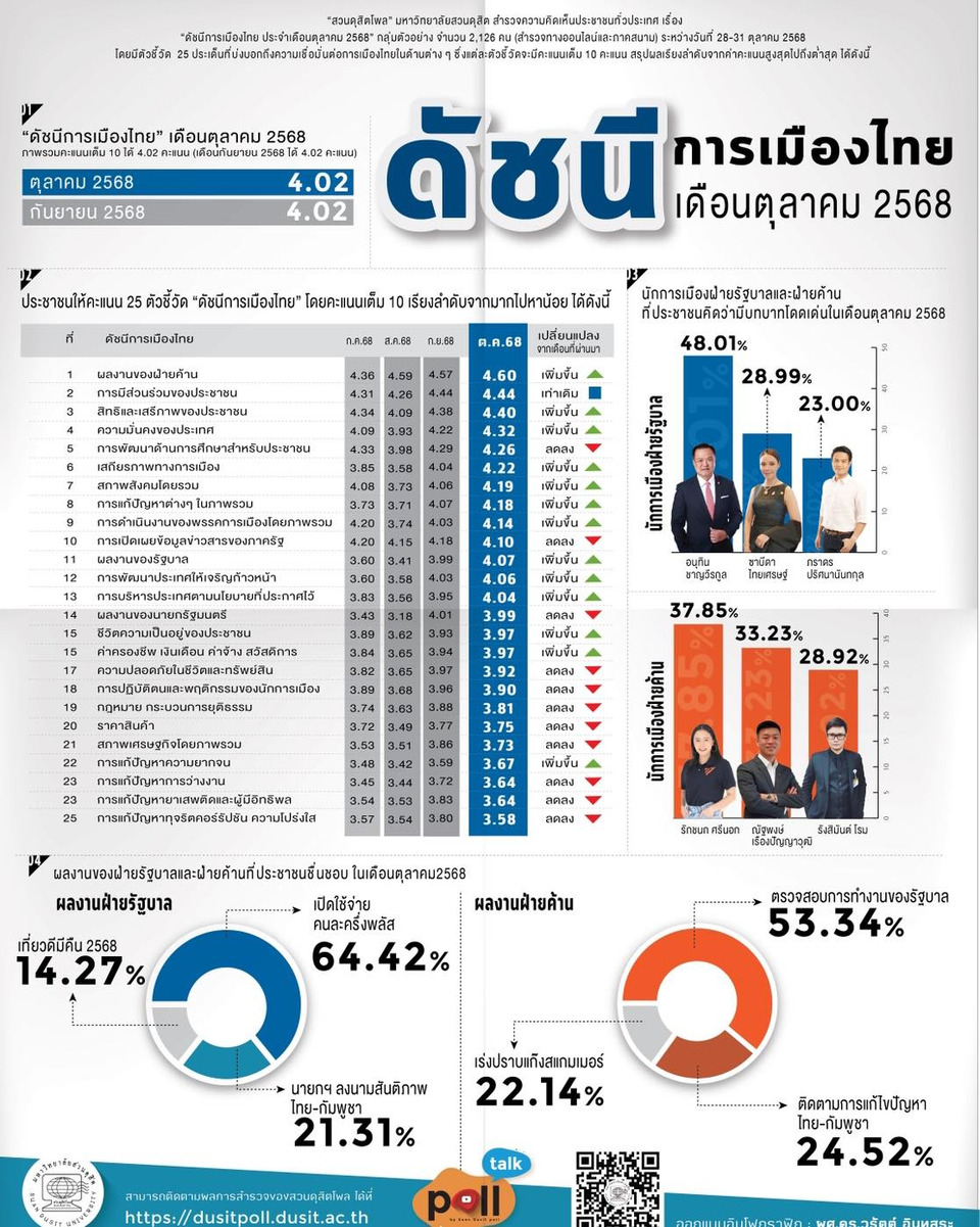 วันที่ 2 พฤศจิกายน 2568 “สวนดุสิตโพล” มหาวิทยาลัยสวนดุสิต สำรวจความคิดเห็นประชาชนทั่วประเทศ เรื่อง “ดัชนีการเมืองไทย ประจำเดือนตุลาคม 2568” กลุ่มตัวอย่าง จำนวน 2,126 คน (สำรวจทางออนไลน์และภาคสนาม) ระหว่างวันที่ 28-31 ตุลาคม 2568 พบว่า กลุ่มตัวอย่างให้คะแนนภาพรวมดัชนีการเมืองไทยประจำเดือนตุลาคม 2568 เฉลี่ย 4.02 คะแนน เท่ากับเดือนกันยายน 2568 ที่ได้ 4.02 คะแนน