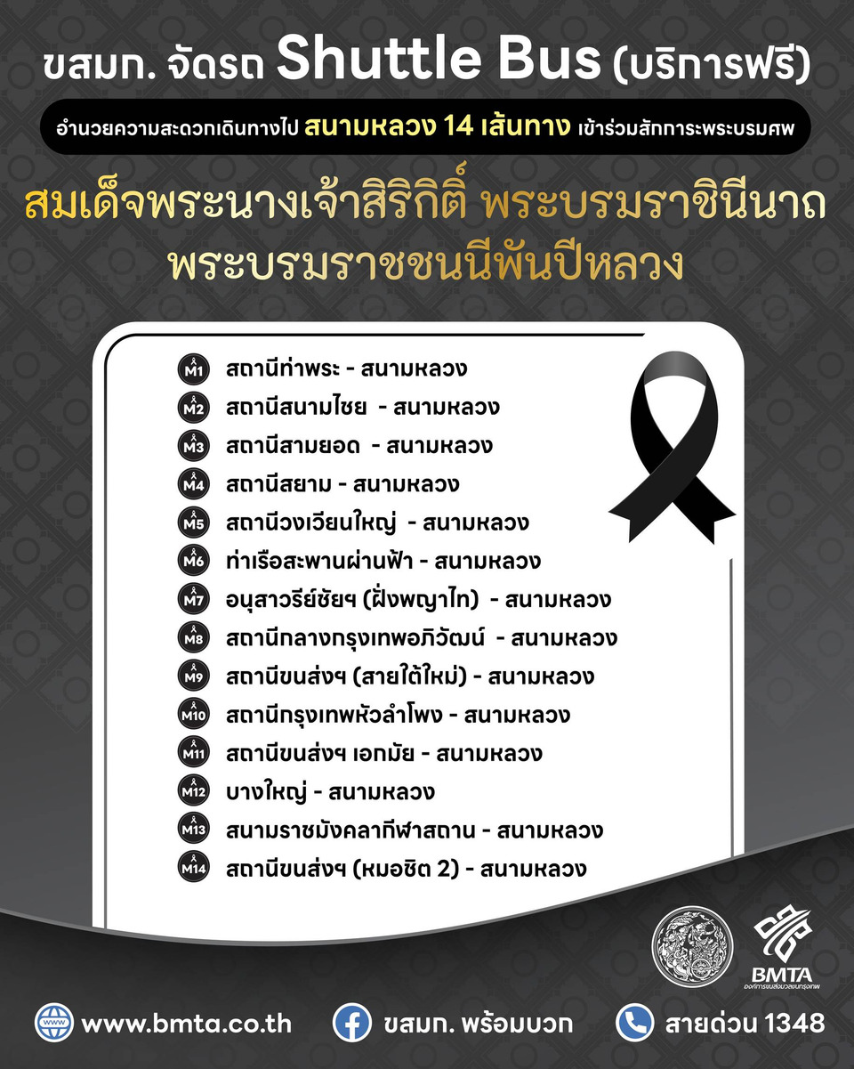 ขสมก. จัดรถ Shuttle Bus (ฟรี)14 เส้นทาง จากจุดสำคัญทั่วกทม.ทุกวัน 8.00-20.00 น. ส่งประชาชนออกจากพื้นที่หมด อำนวยความสะดวกในการเดินทางไปสนามหลวง เพื่อเข้าร่วมสักการะพระบรมศพสมเด็จพระนางเจ้าสิริกิติ์ พระบรมราชินีนาถ พระบรมราชชนนีพันปีหลวง