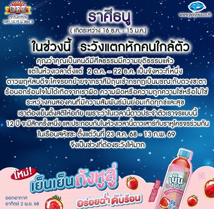 เมื่อวันที่ 2 พ.ย.68 "ลักษณ์ ราชสีห์" หรือ "หมอลักษณ์ ฟันธง" นักพยากรณ์ชื่อดัง ทำนายดวงผ่านอินสตาแกรม @polyplus_jad_hai ระบุว่า ราศีธนู ในช่วงนี้ ระวังแตกหักคนใกล้ตัว