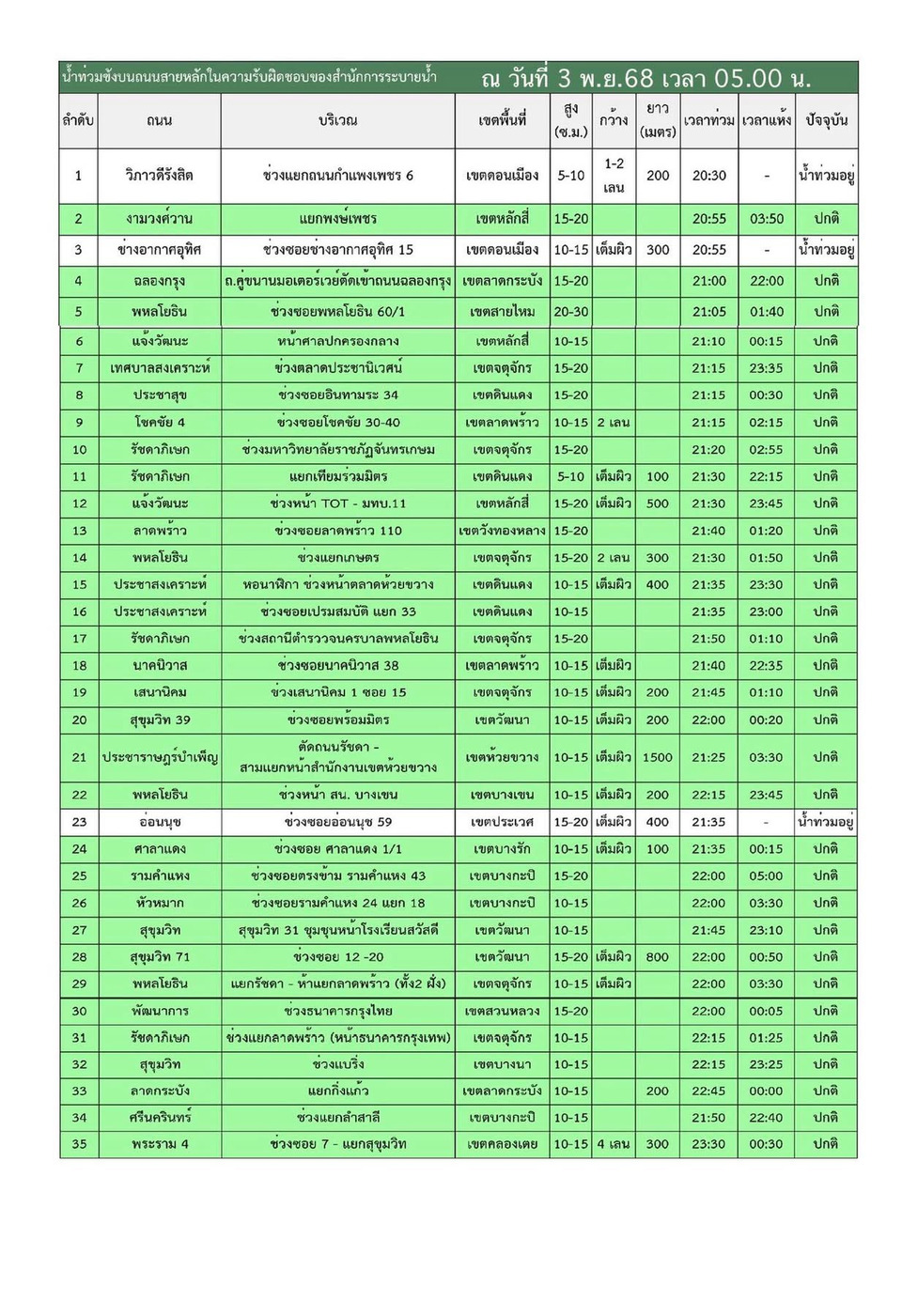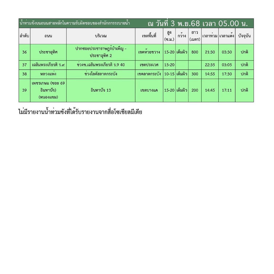 วันที่ 3 พฤศจิกายน 2568 ศูนย์ป้องกันน้ำท่วม กรุงเทพมหานคร ได้รายงานสถานการณ์น้ำท่วมถนนล่าสุด ณ เวลา 05.00 น. หลังเกิดฝนตกหนักตลอดคืนที่ผ่านมาทั่วพื้นที่กรุงเทพมหานคร ซึ่งเป็นผลให้ระดับน้ำในคลองหลายแห่งอยู่ในระดับสูง