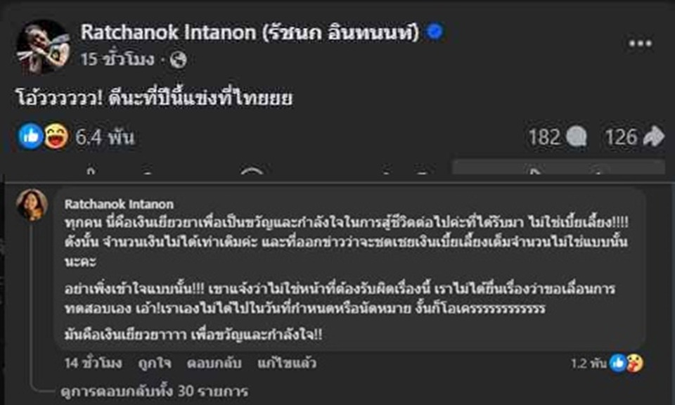 ล่าสุด "เมย์" รัชนก อินทนนท์ นักตบลูกขนไก่สาว โพสต์ข้อความผ่านเฟซบุ๊ก Ratchanok Intanon (รัชนก อินทนนท์) ระบุว่า...