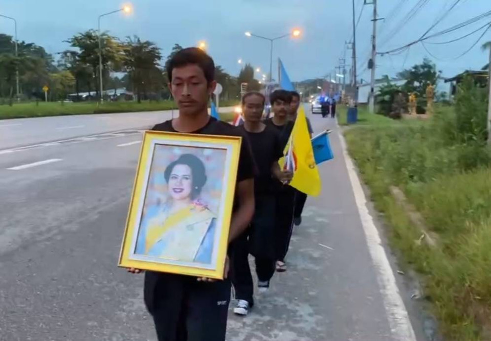 ชาวสุราษฎร์ธานี 7 คน เดินเท้า 250 กิโลเมตร ผ่านประจวบฯ มุ่งหน้าเข้ากรุงเทพฯ ถวายอาลัยและสักการะพระบรมศพ สมเด็จพระพันปีหลวง