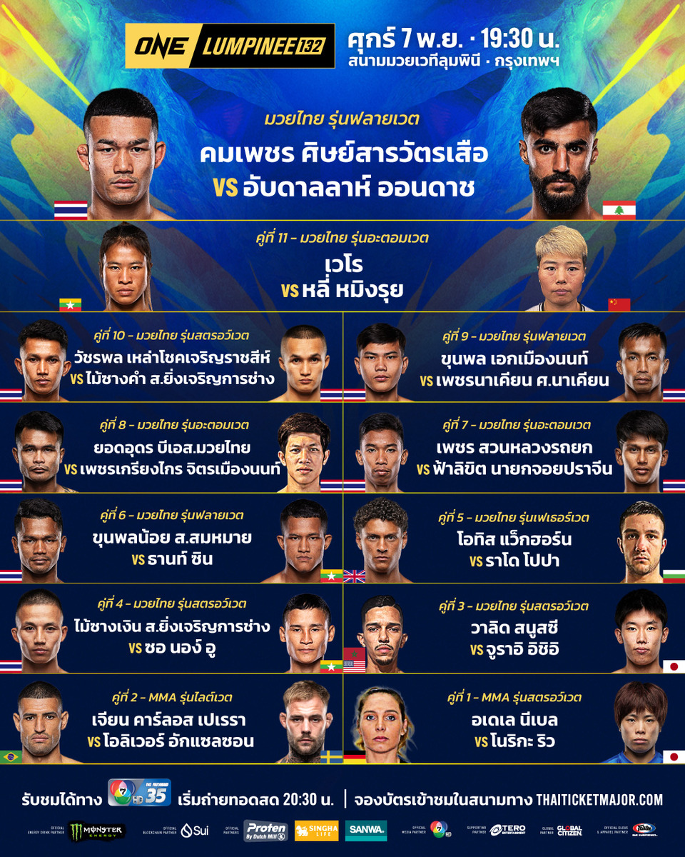 ศึก ONE ลุมพินี 132 ถ่ายทอดสดจากสนามมวยเวทีลุมพินี (รามอินทรา) วันศุกร์ที่ 7 พ.ย.นี้ แฟนกีฬาการต่อสู้ชาวไทยสามารถจองบัตรเข้าชมในสนามผ่านทาง THAI TICKET MAJOR คู่แรกเริ่มเวลา 19.30 น. และรับชมทางช่องทางต่าง ๆ ดังนี้