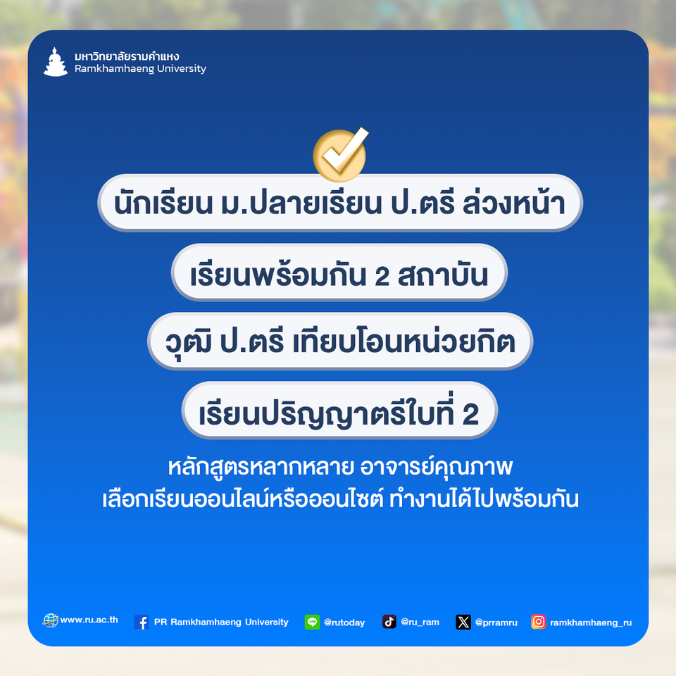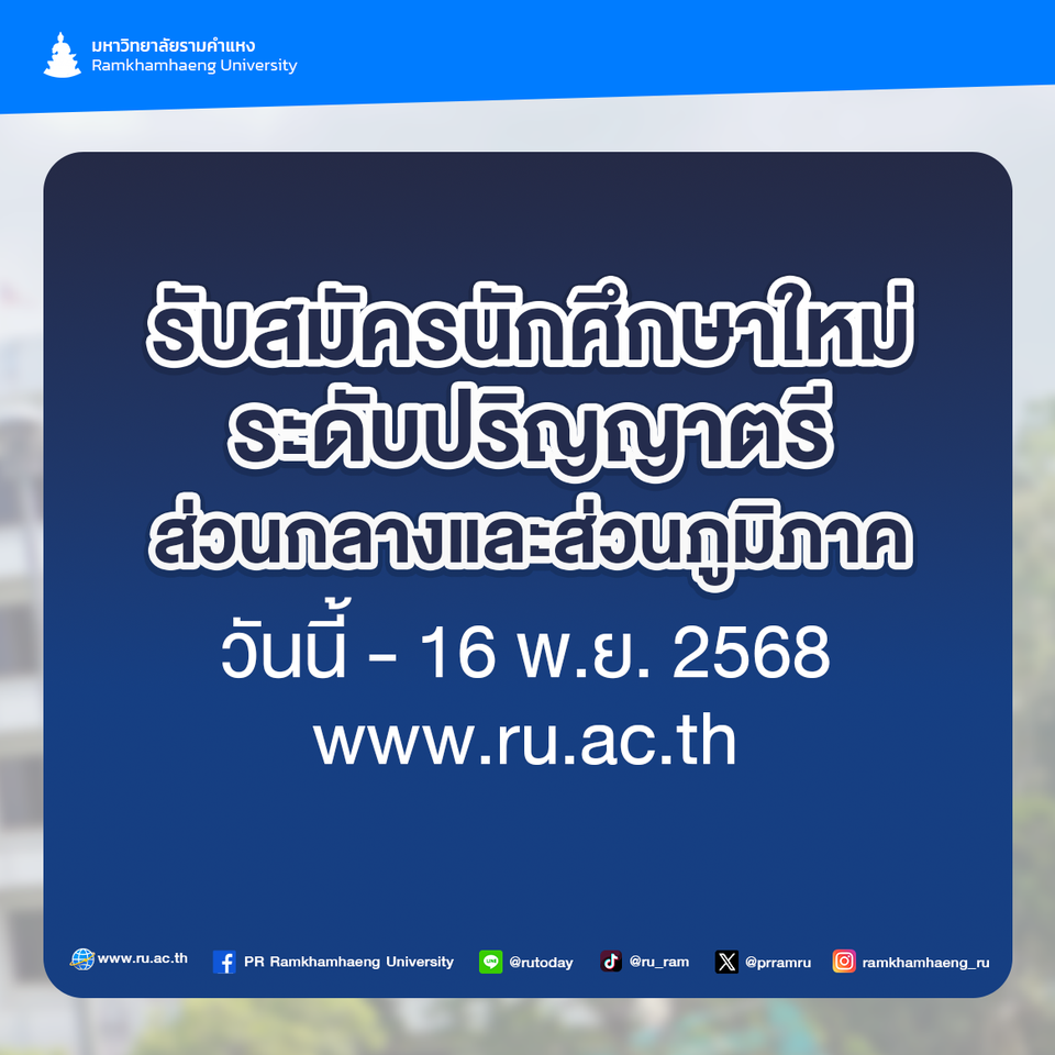 สมัครด้วยตนเอง วันที่ 12 – 16 พฤศจิกายน 2568 ณ มหาวิทยาลัยรามคำแหง (หัวหมาก) และสาขาวิทยบริการฯ 23 จังหวัดทั่วประเทศ