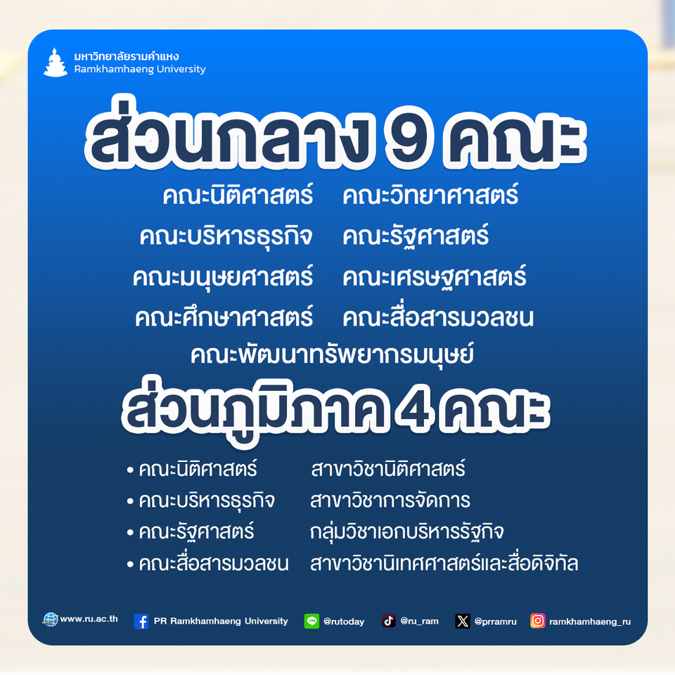สอบถามรายละเอียดเพิ่มเติมได้ที่ งานประชาสัมพันธ์ อาคารสุโขทัย ชั้น 2 หรือฝ่ายรับสมัคร สำนักบริการทางวิชาการและทดสอบประเมินผล อาคาร สวป. ชั้น 3 โทร. 0-2310-8614-15, 0-2310-8623-24 เว็บไซต์ www.ru.ac.th หรือติดตามข่าวสารได้ที่ Facebook : PR Ramkhamhaeng University