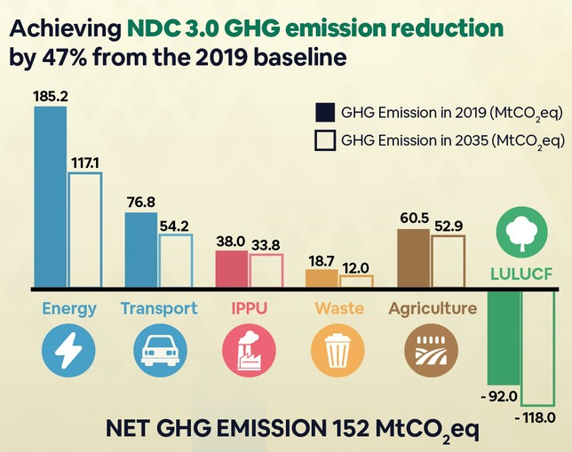 นายสุชาติ ชมกลิ่น รองนายกรัฐมนตรีและรัฐมนตรีว่าการกระทรวงทรัพยากรธรรมชาติและสิ่งแวดล้อม (รมว.ทส.) เปิดเผยว่า คณะรัฐมนตรี (ครม.) เมื่อวันที่ 4 พฤศจิกายน 2568 มีมติเห็นชอบต่อร่างเป้าหมายการมีส่วนร่วมที่ประเทศกำหนด ฉบับที่ 2 (NDC 3.0) ซึ่งเป็นก้าวสำคัญในการเร่งเป้าหมาย Net Zero ให้เร็วขึ้น 15 ปี เพื่อให้สอดคล้องกับ 1.5 ºC Pathway ตามนโยบายของรัฐบาลข้อ 13 การผลักดันสังคมคาร์บอนต่ำ ที่นายกรัฐมนตรีอนุทิน ชาญวีรกูล แถลงต่อรัฐสภา โดยมุ่งลดการปล่อยก๊าซเรือนกระจกในทุกภาคส่วนของเศรษฐกิจ (Economy-wide) ณ ปี ค.ศ. 2035 (พ.ศ. 2578) และเร่งเพิ่มเป้าหมายการดูดกลับก๊าซเรือนกระจกในภาคป่าไม้และการใช้ประโยชนที่ดิน (LULUCF) ซึ่งจะทำให้ประเทศไทยมีระดับการปล่อยก๊าซเรือนกระจกสุทธิ 152 MtCO2eq หรือลดลงร้อยละ 47 จากระดับการปล่อยก๊าซเรือนกระจกในปี ค.ศ. 2019 รวมถึงได้จัดทำแผนการลงทุนเพื่อดึงเม็ดเงินจากต่างประเทศ 230,000 ล้านบาท ในการสนับสนุนไทยลดก๊าซเรือนกระจก 32.8 MtCO2eq ตามเงื่อนไขของความตกลงปารีส