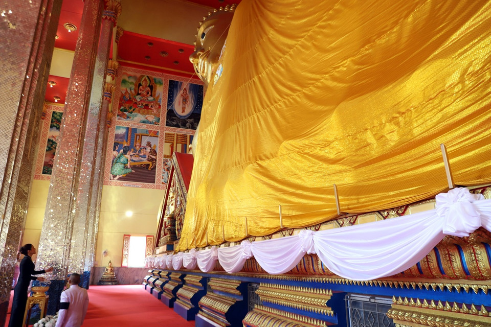 สมเด็จพระศากยมุณีศรีสุเมธบพิตร เป็นพระพุทธรูปปางสีหไสยาสน์ที่ใหญ่ที่สุดในประเทศไทย ยาว 26 วา 1 ศอก 9 นิ้ว กว้าง 3 วา 1 ศอก สร้างเมื่อปีพ.ศ. 2521 โดยมีสมเด็จพระอริยวงศาคตญาณ สมเด็จพระสังฆราช (วาสน์ วาสนมหาเถระ) วัดราชบพิธสถิตมหาสีมาราม ประกอบวางศิลาฤกษ์และตั้งพระนาม (สมเด็จพระศากยมุณีศรีสุเมธบพิตร) และ สมเด็จพระญาณสังวร สมเด็จพระสังฆราช (เจริญ สุวฑฺฒนมหาเถระ) วัดบวรนิเวศวิหาร เป็นประกอบพิธีเบิกเนตร ในปีพุทธศักราช 2528 พระนอนใหญ่สร้างเสร็จสมบูรณ์ ในปีพุทธศักราช 2534 ความพิเศษของสมเด็จพระศากยมุณีศรีสุเมธบพิตร คือสามารถเข้าไปปิดทองที่หัวใจพระนอนได้ ในองค์พระนั้น มี 4 ชั้น แต่ละชั้นจะมีภาพเขียน เรื่องราวต่างๆ และชั้นที่ 4 จะมีหัวใจพระนอน ที่สามารถสักการะและปิดทองได้