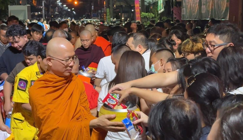 สองข้างทางเต็มไปด้วยพุทธศาสนิกชนที่แต่งชุดขาว มายืนรอตั้งแต่ก่อนเที่ยงคืน ต่างนำอาหาร น้ำดื่ม และของแห้งมาร่วมใส่บาตร เพื่อความเป็นสิริมงคลแก่ชีวิตตามความเชื่อของชาวล้านนา ที่เชื่อว่าการตักบาตรพระอุปคุตใน “วันเป็งปุ๊ด” จะช่วยเสริมโชคลาภ ความรุ่งเรือง และปัดเป่าสิ่งไม่ดีออกจากชีวิต