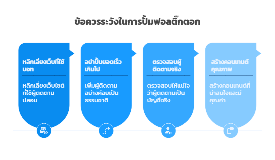 การเพิ่มผู้ติดตามรวดเร็วเกินไปอาจทำให้ระบบ TikTok ตรวจจับความผิดปกติได้ควรค่อยๆ เพิ่มยอดอย่างเป็นธรรมชาติและสอดคล้องกับการเติบโตของคอนเทนต์