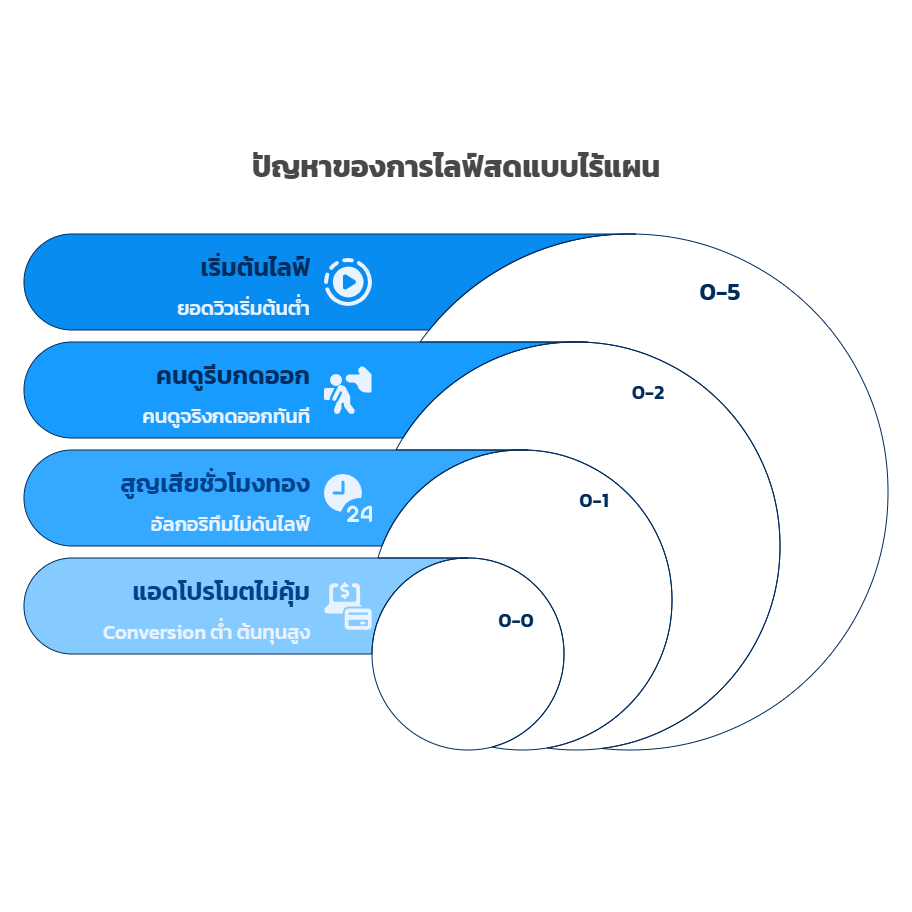 ● แม้จะยิงแอดโปรโมตไลฟ์ก็ไม่คุ้มค่า เพราะเมื่อคนกดเข้ามาแล้วเห็นว่าบรรยากาศว่างเปล่า ก็มักกดออกทันที ส่งผลให้ Conversion ต่ำ และต้นทุนโฆษณาสูงโดยเปล่าประโยชน์