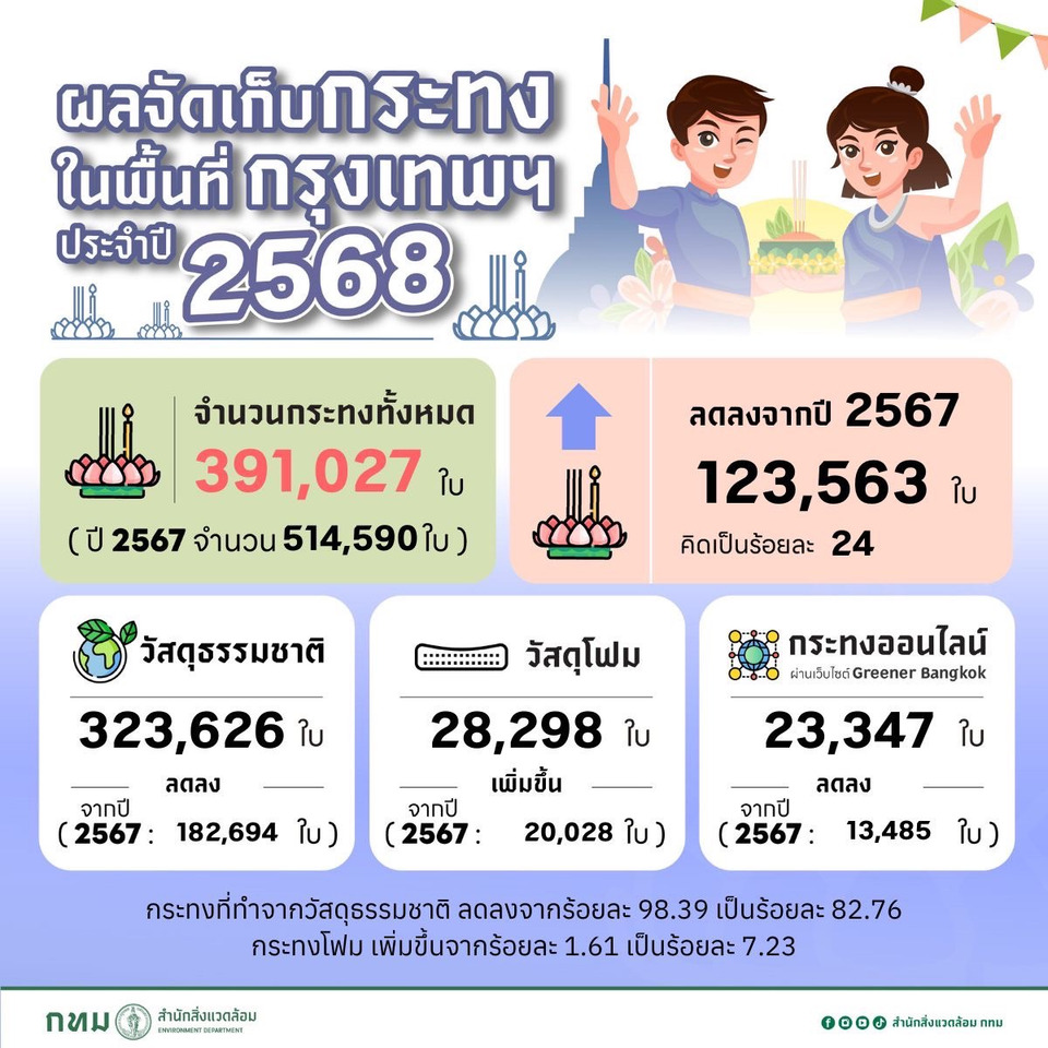 กทม. ขอขอบคุณทุกท่านที่ร่วมกันสืบสานประเพณีภายใต้แนวคิด “ลอยกระทงรักษ์โลก มาด้วยกัน ลอยด้วยกัน 1 ครอบครัว 1 กระทง” เพื่อช่วยลดปริมาณขยะและดูแลสิ่งแวดล้อมอย่างยั่งยืน