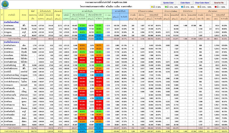 นายสุคนธ์ ผอ.โครงการชลประทานนครราชสีมา เปิดเผยว่า สถานการณ์อ่างเก็บน้ำขนาดกลาง 25 แห่ง ล่าสุดมีปริมาณน้ำ 266.61 ล้าน ลบ.เมตร คิดเป็น 78.51 % ของพื้นที่เก็บกัก โดยมีจำนวน 18 อ่าง ฯ ปริมาณน้ำต้นทุนเกิน 90 % ประกอบด้วยอ่างห้วยบ้านยาง อ.เมือง ,อ่างห้วยยาง อ.ปักธงชัย ,อ่างบะอีแตน อ่างลำเชียงสา อ่างบ้านสันกำแพง อ.วังน้ำเขียว ,อ่างบ้านซับกระจาย อ.สีคิ้ว ,อ่างทับรั้ง อ.เทพารักษ์ ,อ่างลำเชียงไกรตอนบน อ.ด่านขุนทด ,อ่างลำเชียงไกรตอนล่าง อ.โนนไทย ,อ่างหนองกก อ.พระทองคำ ,อ่างห้วยตะคร้อ อ.คง ,อ่างห้วยน้ำเค็ม อ.บัวใหญ่ ,อ่างห้วยยางพะไล อ.แก้งสนามนาง ,อ่างห้วยบง อ.ชุมพวง ,อ่างห้วยสะกาด อ.พิมาย ,อ่างลำฉมวก อ.ห้วงแถลง ,อ่างห้วยเพรียก อ.ครบุรี ,อ่างห้วยหิน อ.เสิงสาง และอ่างห้วยเตย อ.เสิงสาง ส่วนปริมาณน้ำต้นทุนในเขื่อนขนาดใหญ่ 4 แห่ง ประกอบด้วย เขื่อนลำตะคอง อ.สีคิ้ว เขื่อนลำพระเพลิง อ.ปักธงชัย เขื่อนลำแชะ และ เขื่อนลำมูลบน อ.ครบุรี ปริมาณน้ำรวม 510 ล้าน ลบ.เมตร คิดเป็น 57.61 % ของพื้นที่ความจุทั้งหมด ซึ่งยังเหลือพื้นที่รองรับย้ำอีกค่อนข้างมาก
