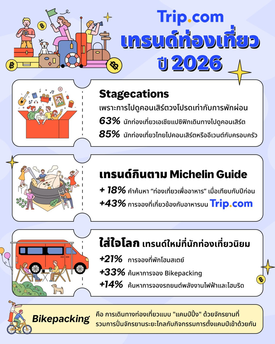 • "Stagecations" กำลังได้รับความนิยมในกลุ่มครอบครัว: Stagecation หรือการการท่องเที่ยวเพื่อชมความบันเทิงสดกำลังได้รับความนิยมเพิ่มขึ้น ปัจจุบันนักเดินทางในภูมิภาคเอเชียแปซิฟิกกว่า 63% เดินทางเพื่อชมคอนเสิร์ตหรือ่วมงานอีเวนต์ ขณะที่นักท่องเที่ยวชาวไทยถึง 85% มักผสมผสานทริปคอนเสิร์ตหรือเทศกาลเข้ากับการท่องเที่ยวพักผ่อนของครอบครัว โดยมีเมืองศูนย์กลางยอดนิยมอย่างมาเก๊า ลาสเวกัส เมลเบิร์น และสิงคโปร์เป็นจุดหมายหลัก