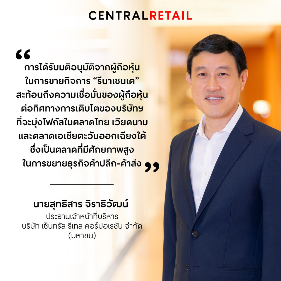 นายสุทธิสาร จิราธิวัฒน์ ประธานเจ้าหน้าที่บริหาร บริษัท เซ็นทรัล รีเทล คอร์ปอเรชั่น จำกัด (มหาชน) หรือ CRC เปิดเผยว่า ที่ประชุมผู้ถือหุ้นมีมติ “อนุมัติ” การขายสินทรัพย์ที่เกี่ยวข้องกับธุรกิจห้างสรรพสินค้ารีนาเชนเต ด้วยคะแนนเสียงเห็นชอบจำนวน 3,159,952,199 คะแนน คิดเป็น 89.57% ของผู้ถือหุ้นที่เข้าร่วมประชุมและไม่มีส่วนได้เสียที่มีสิทธิออกเสียง มติดังกล่าวถือเป็นอีกก้าวสำคัญของการดำเนินงานตามยุทธศาสตร์ของ CRC ที่มุ่งปรับโครงสร้างธุรกิจเพื่อเสริมความแข็งแกร่งและสร้างการเติบโต โดยมุ่งโฟกัสที่ 2 ตลาดหลัก คือ ประเทศไทยและเวียดนาม รวมถึงตลาดเอเชียตะวันออกเฉียงใต้ ซึ่งเป็นตลาดที่มีศักยภาพสูงในการขยายธุรกิจค้าปลีก-ค้าส่งตามกลยุทธ์ ‘New Heights, Next Growth’ พร้อมยกระดับขีดความสามารถในการแข่งขัน ตอบโจทย์การเติบโตในระยะยาว ตอกย้ำภาพผู้นำธุรกิจค้าปลีก-ค้าส่งอย่างยั่งยืนทั้งในประเทศไทยและต่างประเทศ สร้างคุณค่าและผลตอบแทนที่มั่นคงให้แก่ทุกฝ่ายที่เกี่ยวข้อง ภายใต้การดำเนินงานอย่างโปร่งใส ตรวจสอบได้ และเป็นไปตามหลักการกำกับดูแลกิจการที่ดี โดยเงินที่ได้รับจำนวนประมาณ 14,700 ล้านบาท จะนำไปบริหารจัดการในการสร้างการเติบโต และเสริมแกร่งสถานะทางการเงินของบริษัทฯ โดยนำเงินสดไปคืนเงินกู้ยืมจากสถาบันการเงิน ส่งผลให้ภาระหนี้สินของบริษัทฯ ลดลงประมาณ 5,300 ล้านบาท ทำให้ CRC มีความพร้อมในการขยายธุรกิจเพื่อต่อยอดสร้างการเติบโตในอนาคต นอกจากนี้ CRC มีแผนพิจารณานำเงิน 7,700 ล้านบาท ไปจ่ายเป็นเงินปันผลเป็นกรณีพิเศษ คิดเป็น 1.28 บาทต่อหุ้น สร้างผลตอบแทนโดยทันทีให้แก่ผู้ถือหุ้นของ CRC