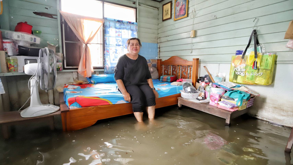 นางเล็ก แผนรัก อายุ 67 ปี ชาวบ้านในหมู่ 4 ตำบลบ้านฉาง บอกว่าที่บ้านถูกน้ำท่วมมาตั้งแต่กลางเดือนสิงหาคม ระดับน้ำเหลืออีกประมาณ 10 ซม. น้ำจะท่วมถึงพื้นบ้านชั้น 2 ต้องเตรียมที่จะขนของหนีน้ำ เตรียมหาซื้ออุปกรณ์ยกพื้นบ้าน ซึ่งต้องมีค่าใช้จ่าย ต้องขอขอบคุณรัฐบาล ที่ให้เงินเยี่ยวยาน้ำท่วมมาแล้ว 9,000 บาท พอที่จะใช้จ่ายซ่อมแซมบ้านได้ ทุกวันนี้ใช้ชีวิตอย่างยากลำบาก ต้องพายแพโฟมเข้าออกบ้าน ไม่อย่างนั้น ก็ต้องเดินสะพานไม้ที่เทศบาลตำบลบางหลวงทำไว้ให้ สุขภาพของตนไม่ค่อยดี มีโรคประจำตัวหลายโรค เดินสะพานไม้ก็กลัวจะวูบ ทุกวันนี้ต้องคอยดูระดับน้ำที่ขึ้นทุกวัน