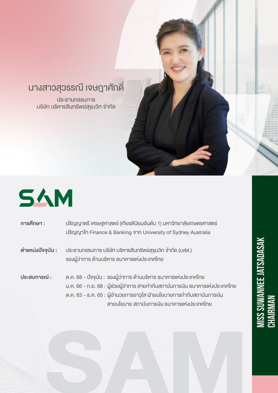 คณะกรรมการ บริษัท บริหารสินทรัพย์สุขุมวิท จำกัด (บสส.) หรือ SAM มีมติ แต่งตั้ง “สุวรรณี เจษฎาศักดิ์” รับตำแหน่งประธานบอร์ด SAM คนใหม่ มีผลตั้งแต่วันที่ 1 พฤศจิกายน 2568
