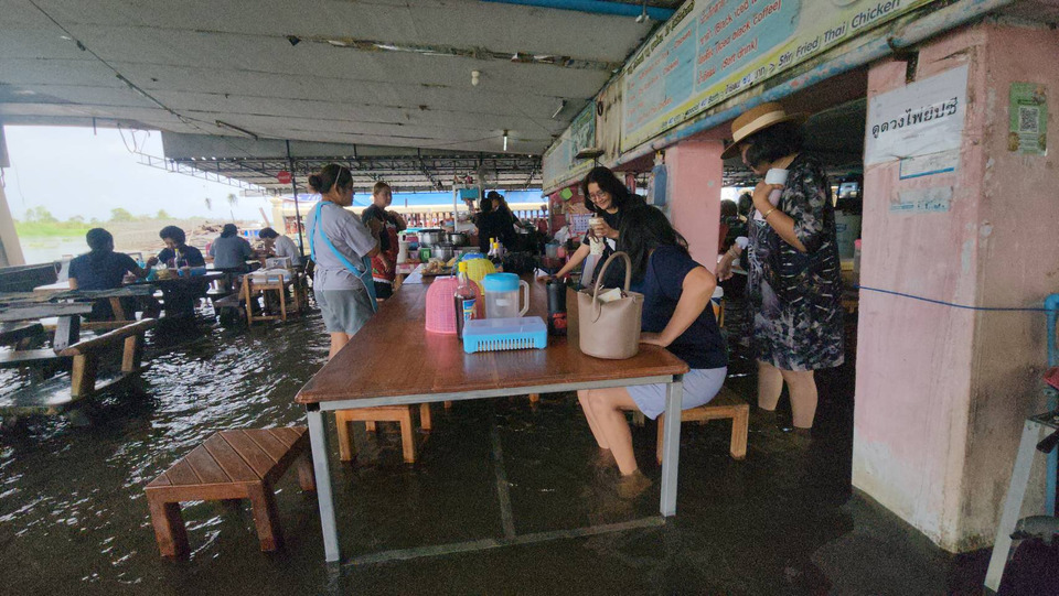 แม้จะมีการคาดการณ์มวลน้ำจากแม่น้ำท่าจีน แต่ปีนี้สถานการณ์น้ำท่วมหลากเข้ามาอย่างรวดเร็วเป็นพิเศษ ทำให้ปลาตะเพียนเงินตะเพียนทองจำนวนหลายพันตัวที่อยู่ในแม่น้ำ ว่ายเวียนเข้ามาในร้านก๋วยเตี๋ยวอย่างแปลกตา สร้างความเพลิดเพลินใจแก่ผู้มาเยือน ลูกค้าบางรายยังได้เลี้ยงอาหารปลาไปด้วย ทำให้มีฝูงปลาขนาดใหญ่เข้ามารอกินอาหาร
