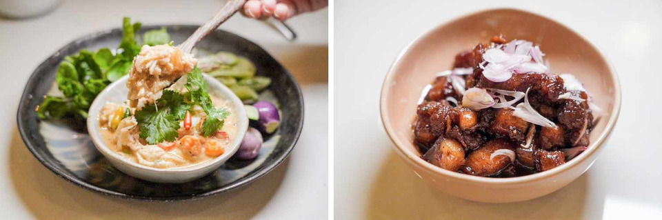 ส่วนอาหารจานหลักเป็นกับข้าวสำหรับแบ่งปันกันบนโต๊ะอาหารแบบครอบครัวไทยนั้น ผสมผสานด้วยรสชาติที่หลากหลาย แตกต่างแต่กลับลงตัว ไม่ว่าจะเป็น หลนปูไข่เค็ม ที่เชฟนก ได้เลือกใช้ไข่เป็ดแดงเค็มมาเพิ่มความมันนัวให้กับหลนปูที่จัดเต็มด้วยเนื้อปูสดหวาน รับประทานคู่กับผักสดนานาชนิด หมูหวาน อาหารที่เรียบง่ายแต่เปี่ยมด้วยรสชาติเข้มข้น สอดแทรกด้วยกลิ่นหอมหวานเป็นพิเศษ ด้วยสูตรลับเฉพาะที่ส่งต่อจากรุ่นสู่รุ่นของครัวบ้านเชฟนก