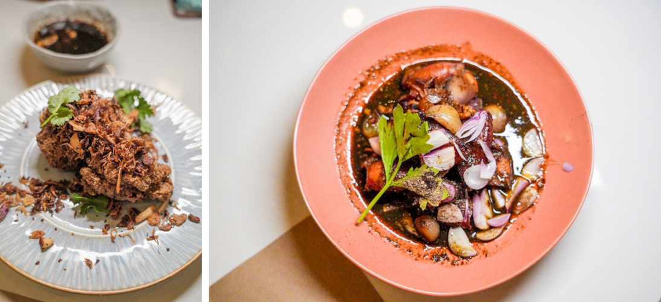 อีกไฮไลต์ของคืนนี้ต้องยกให้กับเมนูธรรมดาที่ไม่ธรรมดาอย่าง ไก่ทอดหาดใหญ่ ที่ถูกใจใครต่อใครด้วยผิวสัมผัสกรอบนอกนุ่มใน แป้งบางกรอบเหมือนฟองสบู่ที่หุ้มเนื้อไก่หวานฉ่ำกำลังดี พร้อมที่จะกะเทาะแตกออกทุกคำที่ลิ้มลอง เสริมรสชาติด้วยน้ำจิ้มไก่สูตรพิเศษ นอกจากนี้ยังมี หมึกต้มน้ำดำ โดดเด่นด้วยรสชาติที่เรียบง่าย เค็มนำหวานตาม ชวนให้ชิมกับข้าวสวยร้อน ๆ อย่างไม่รู้เบื่อ