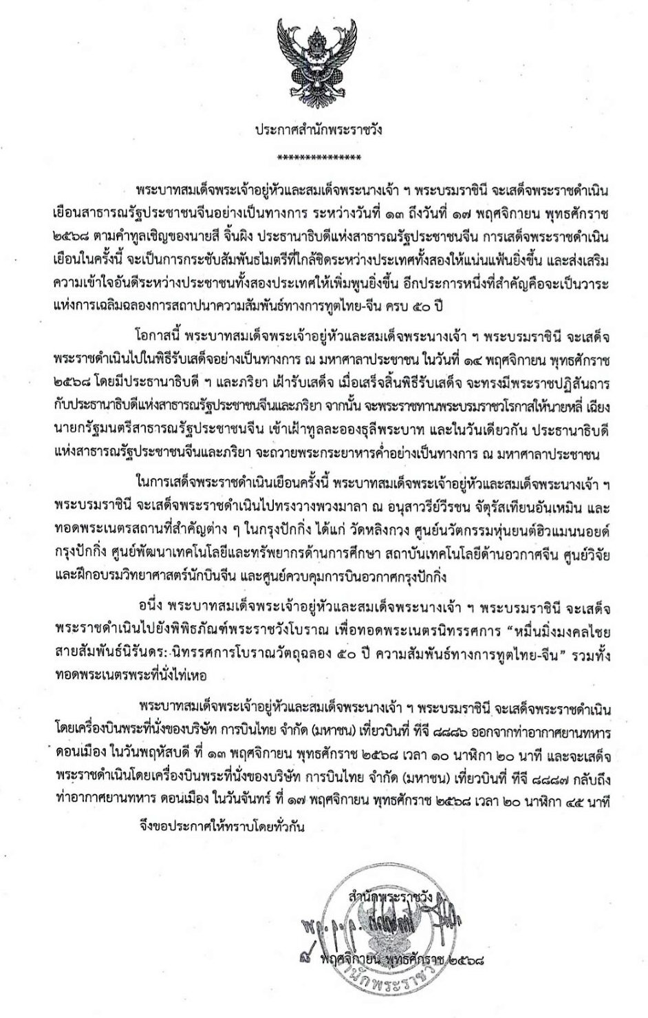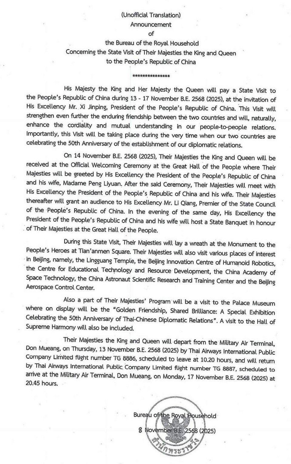 วันที่ 8 พ.ย.68 สำนักพระราชวัง ได้ออกประกาศความว่า ...พระบาทสมเด็จพระเจ้าอยู่หัวและสมเด็จพระนางเจ้า ฯ พระบรมราชินี จะเสด็จพระราชดำเนินเยือนสาธารณรัฐประชาชนจีนอย่างเป็นทางการ ระหว่างวันที่ 13 ถึงวันที่ 17 พฤศจิกายน พุทธศักราช 2568 ตามคำทูลเชิญของนายสี จิ้นผิง ประธานาธิบดีแห่งสาธารณรัฐประชาชนจีน การเสด็จพระราชดำเนินเยือนในครั้งนี้ จะเป็นการกระชับสัมพันธไมตรีที่ใกล้ชิดระหว่างประเทศทั้งสองให้แน่นแฟ้นยิ่งขึ้น และส่งเสริมความเข้าใจอันดีระหว่างประชาชนทั้งสองประเทศให้เพิ่มพูนยิ่งขึ้น อีกประการหนึ่งที่สำคัญคือจะเป็นวาระแห่งการเฉลิมฉลองการสถาปนาความสัมพันธ์ทางการทูตไทย-จีน ครบ 50 ปี