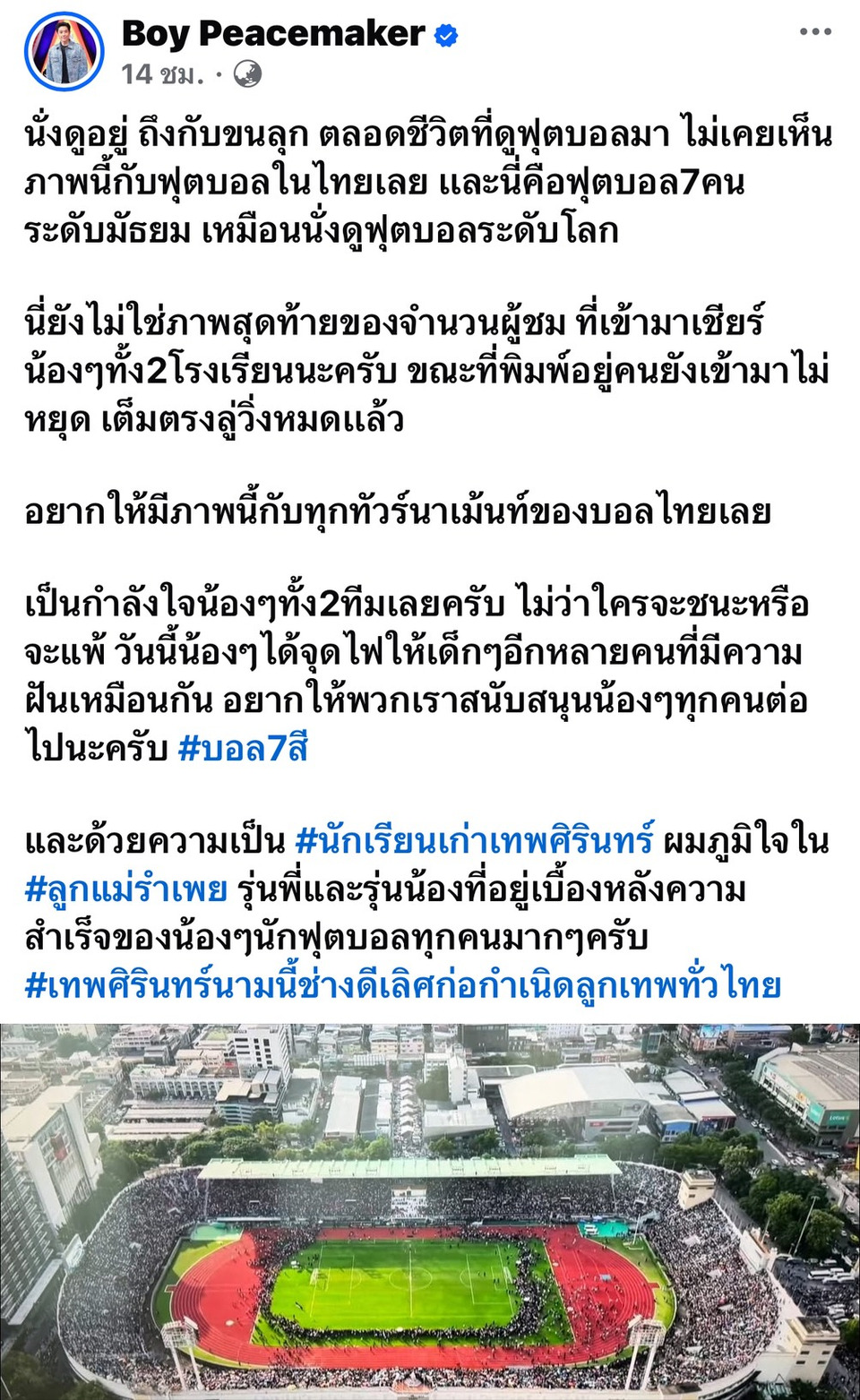 ศิลปินหนุ่มเสียงคุณภาพ “บอย อนุวัฒน์” หรือ “บอย พีซเมกเกอร์” ออกมาโพสต์ข้อความชื่นชมฟุตบอลระดับมัธยม หลังได้ชมการแข่งขันฟุตบอล 7 คนในรายการ #บอล7สี “ขนลุกจริงๆ ไม่เคยเห็นภาพแบบนี้ในชีวิต โดยเจ้าตัวเผยความรู้สึกว่า