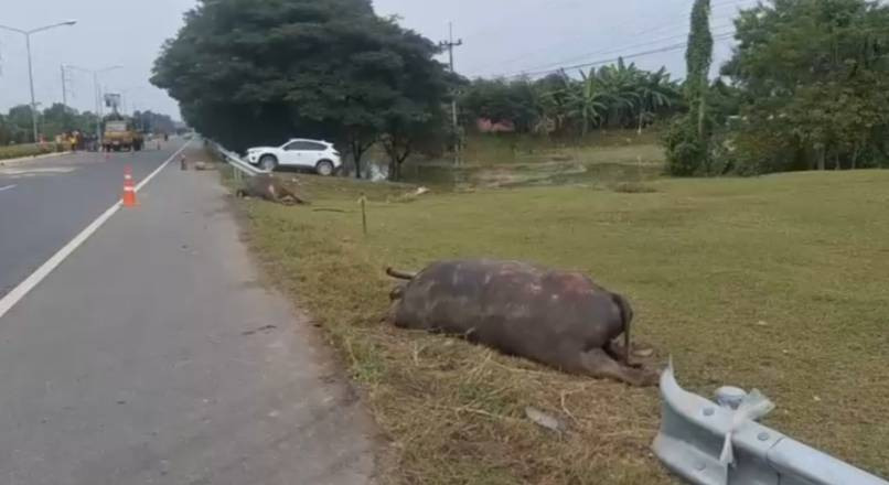 สลด!! รถพุ่งชนฝูงควายกลางดึก ดับ 5 เจ็บ 2 คนขับรอดหวุดหวิด – ยังไร้เจ้าของแสดงตัวรับผิด