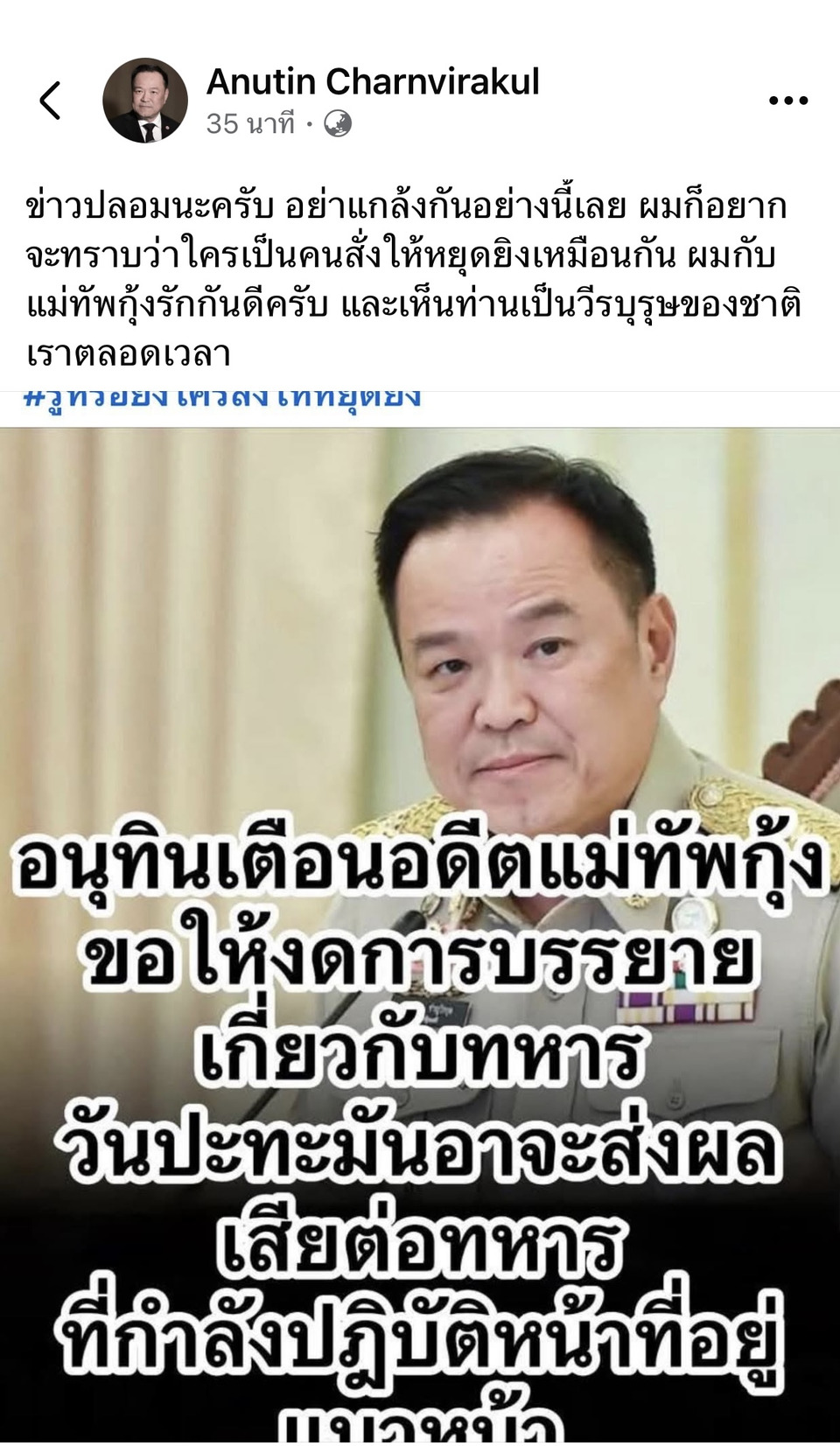 โดยนายอนุทินโพสต์ข้อความระบุว่า “ข่าวปลอมนะครับ อย่าแกล้งกันอย่างนี้เลย ผมก็อยากจะทราบว่าใครเป็นคนสั่งให้หยุดยิงเหมือนกัน ผมกับแม่ทัพกุ้งรักกันดีครับ และเห็นท่านเป็นวีรบุรุษของชาติเราตลอดเวลา”