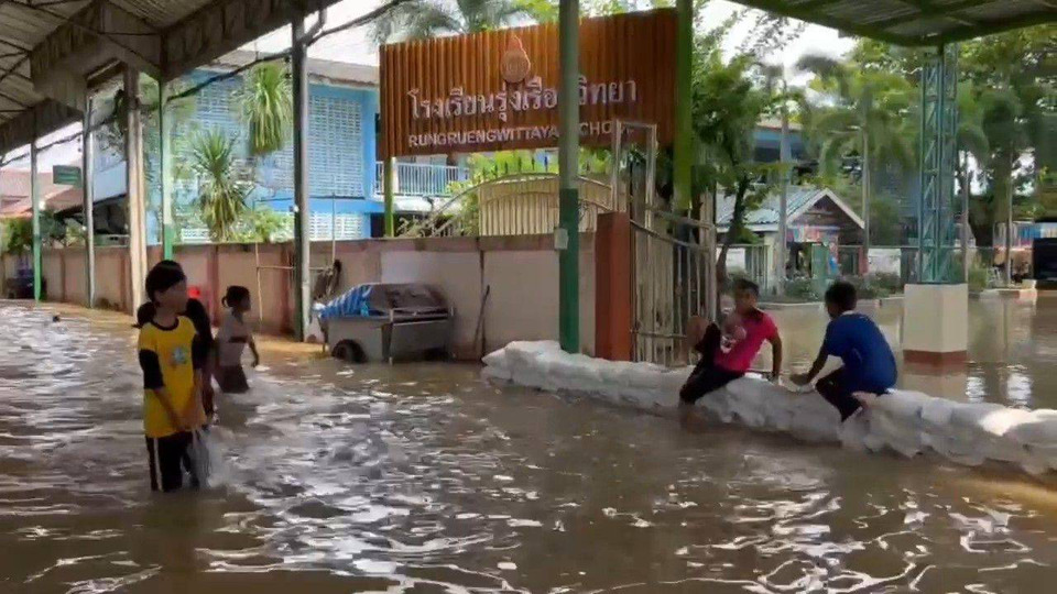 วันที่ 10 พ.ย. 2568 ผู้สื่อข่าวลงพื้นที่โรงเรียนรุ่งเรืองวิทยา ต.ท่าอิฐ อ.ปากเกร็ด จ.นนทบุรี พบว่าสถานการณ์น้ำท่วมสูงจนห้องเรียนชั้นล่างของโรงเรียนจมน้ำ ทำให้โต๊ะนักเรียน ตู้เก็บของ และอุปกรณ์การเรียนของเด็กเล็กเสียหาย ทางโรงเรียนได้ประกาศเลื่อนเปิดเรียนจากเดิมวันที่ 13 พ.ย. หากน้ำไม่ลด อาจต้องปิดโรงเรียนไม่มีกำหนด พร้อมปรับการเรียนการสอนเป็นออนไลน์