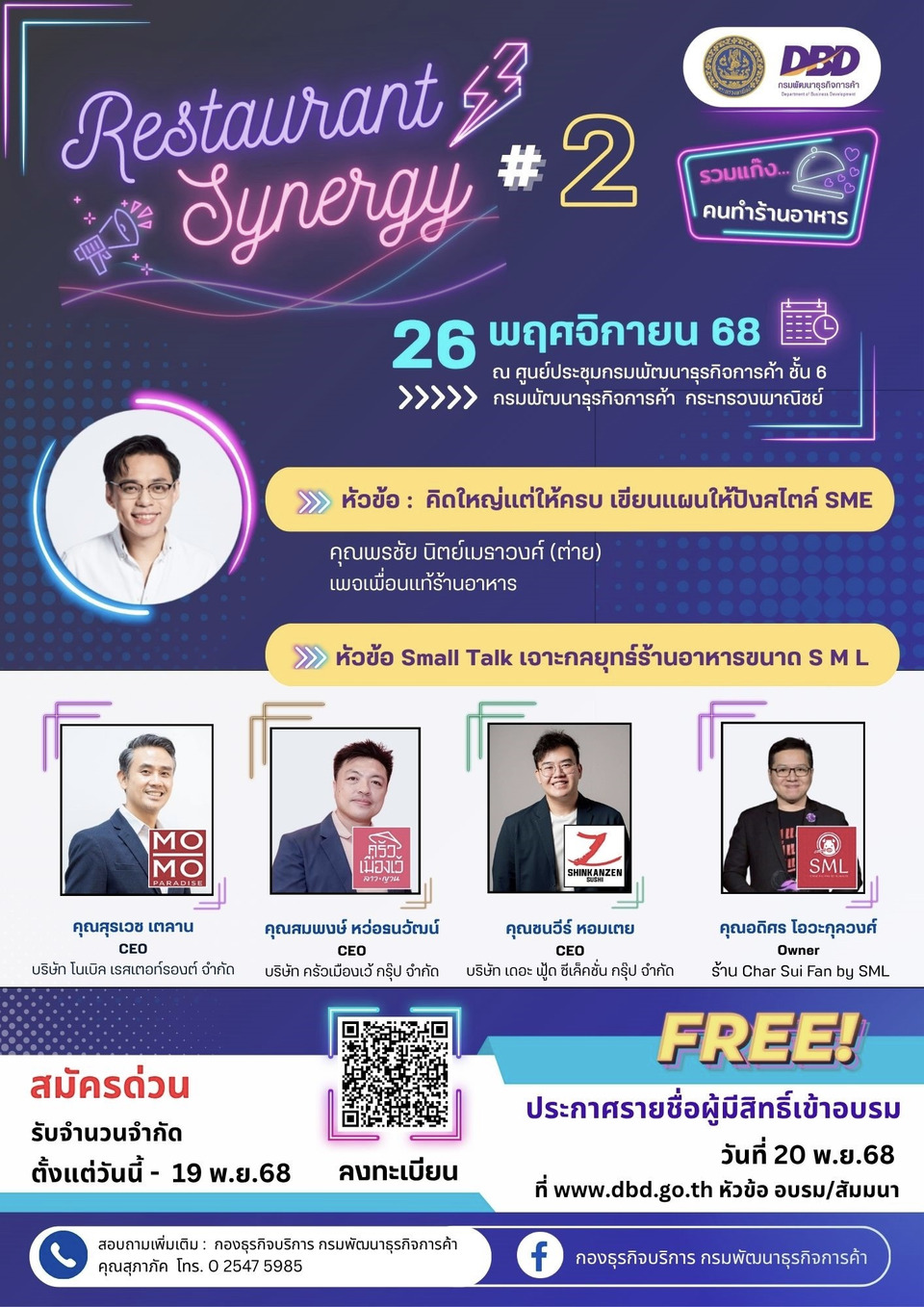 อธิบดีพูนพงษ์ กล่าวต่อว่า กรมฯ ได้กำหนดจัดอบรมในหลักสูตร Restaurant Synergy รุ่นที่ 2 รวมแก๊งคนทำร้านอาหาร ในวันพุธที่ 26 พฤศจิกายน 2568 ณ ชั้น 6 ศูนย์ประชุมกรมพัฒนาธุรกิจการค้า เพื่อเสริมศักยภาพและสร้างเครือข่ายทางธุรกิจ (Business Synergy) ให้ผู้ประกอบการร้านอาหารสามารถเติบโตได้อย่างยั่งยืน โดยในหลักสูตรได้รับเกียรติจากวิทยากรและเป็นเจ้าของธุรกิจร้านอาหารชื่อดังที่มีความเชี่ยวชาญในการบริหารจัดการธุรกิจร้านอาหารมาร่วมบรรยายใน 2 ช่วง ได้แก่ การบรรยายในหัวข้อ ‘คิดใหญ่แต่ให้ครบ เขียนแผนให้ปังสไตล์ SME’ โดย คุณพรชัย นิตย์เมธาวงศ์ ผู้ก่อตั้งเพจเพื่อนแท้ร้านอาหารและที่ปรึกษาธุรกิจร้านอาหาร และการเสวนาในหัวข้อ ‘Small Talk เจาะกลยุทธ์ร้านอาหารขนาด S M L’ จากเจ้าของร้านชื่อดัง อาทิ MOMO, ครัวเมืองเว้, Shinkanzen Sushi และ Char Sui Fan By SML