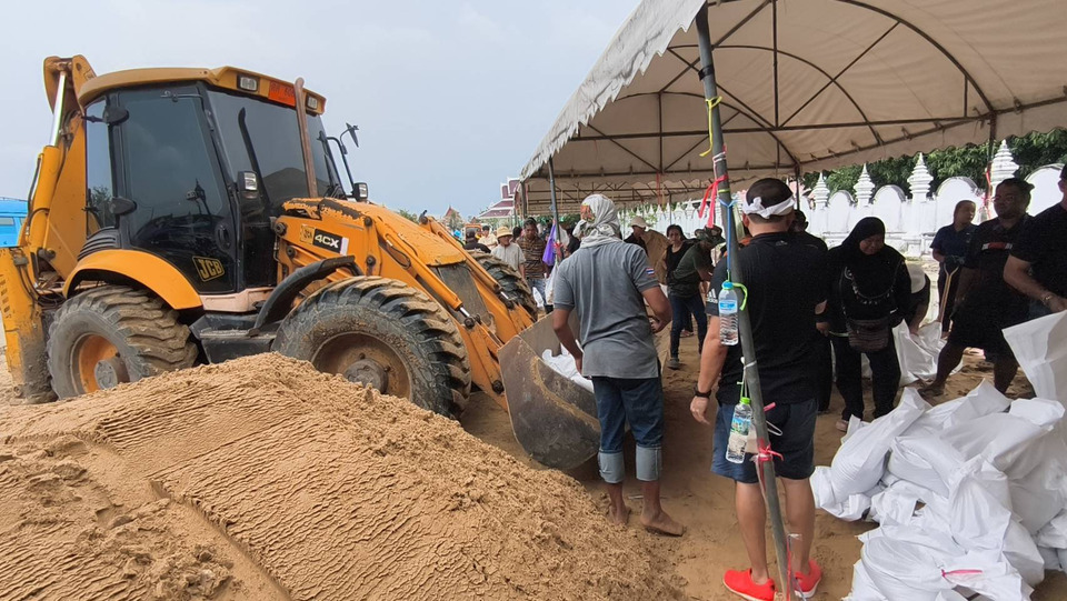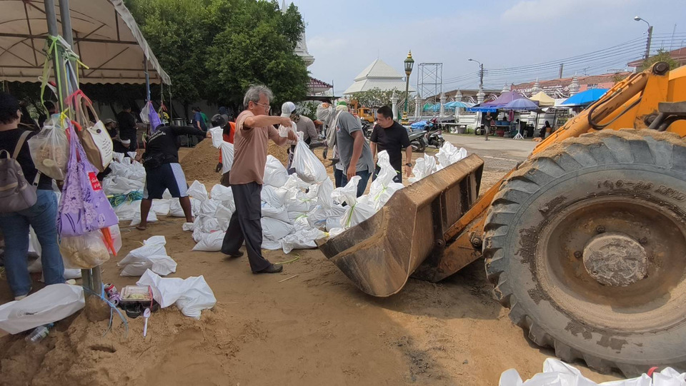 ขณะที่เทศบาลนครปากเกร็ดได้ระดมกำลังพลกองพันระวังป้องกันสำนักงานปลัดกระทรวงกลาโหม อปพร. ผู้นำชุมชน ประชาชน และเจ้าหน้าที่เทศบาลนครปากเกร็ด ร่วมใจกันบรรจุกระสอบทราย จำนวนกว่า 8,700 ใบ เพื่อเสริมแนวคันกั้นน้ำที่มีปริมาณน้ำเพิ่มสูงขึ้น ป้องกันพื้นที่ภายในเขตเทศบาลนครปากเกร็ด หากภายใน 2 วัน ปริมาณน้ำทะเลหนุนจะลดลงต่อเนื่อง คาดว่าน้ำจะลดลง แต่ก็ต้องเฝ้าระวังว่าเขื่อนเจ้าพระยาจะปล่อยน้ำออกมาอีกมากน้อยเพียงใด