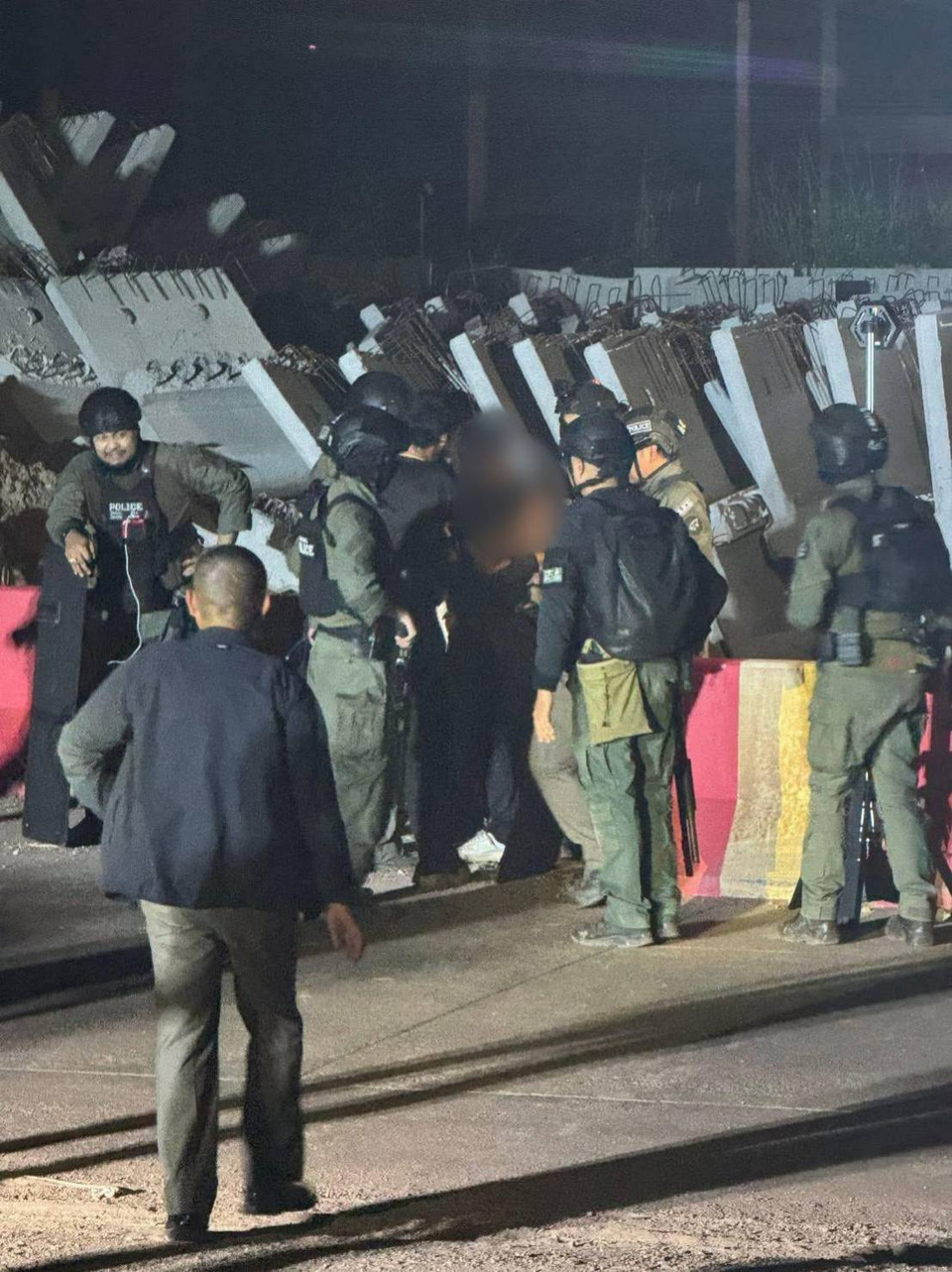 ผู้ก่อเหตุได้ปีนขึ้นไปบนแบริเออร์เกาะกลางสะพานข้ามแยกที่อยู่ระหว่างก่อสร้าง ใช้เป็นที่กำบัง ทำให้การควบคุมตัวยากลำบาก ตำรวจต้องปิดล้อมพื้นที่เป็นวงกว้าง พร้อมเจรจาเกลี้ยกล่อม และพยายามตัดกำลัง โดยนำเครื่องดื่มผสมน้ำยานอนหลับให้ดื่ม แต่อาการคลุ้มคลั่งยังไม่ลดลง