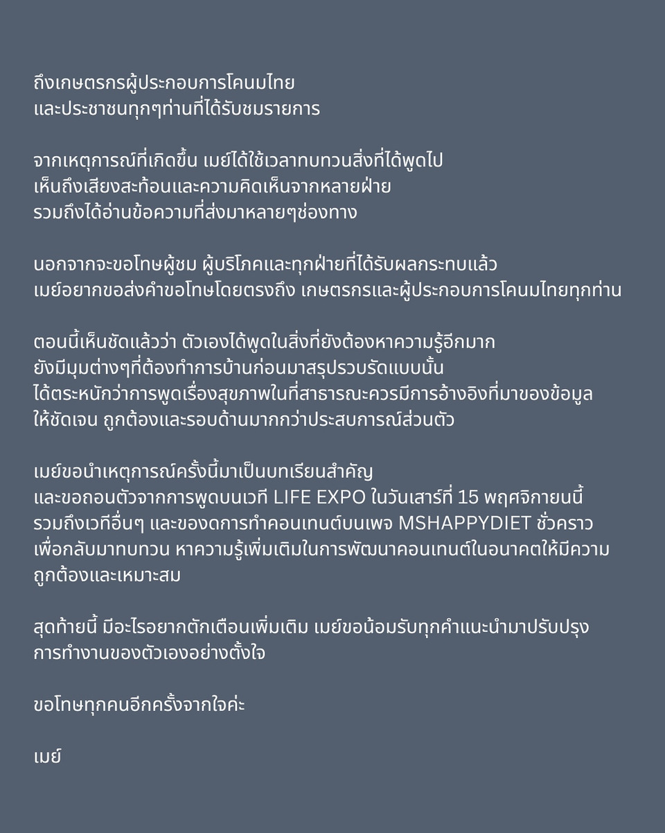 เมย์ขอนำเหตุการณ์ครั้งนี้มาเป็นบทเรียนสำคัญ และขอถอนตัวจากการพูดบนเวที LIFE EXPO ในวันเสาร์ที่ 15 พฤศจิกายนนี้ รวมถึงเวทีอื่นๆ และของดการทำคอนเทนต์บนเพจ MSHAPPYDIET ชั่วคราว เพื่อกลับมาทบทวน หาความรู้เพิ่มเติมในการพัฒนาคอนเทนต์ในอนาคตให้มีความ ถูกต้องและเหมาะสม