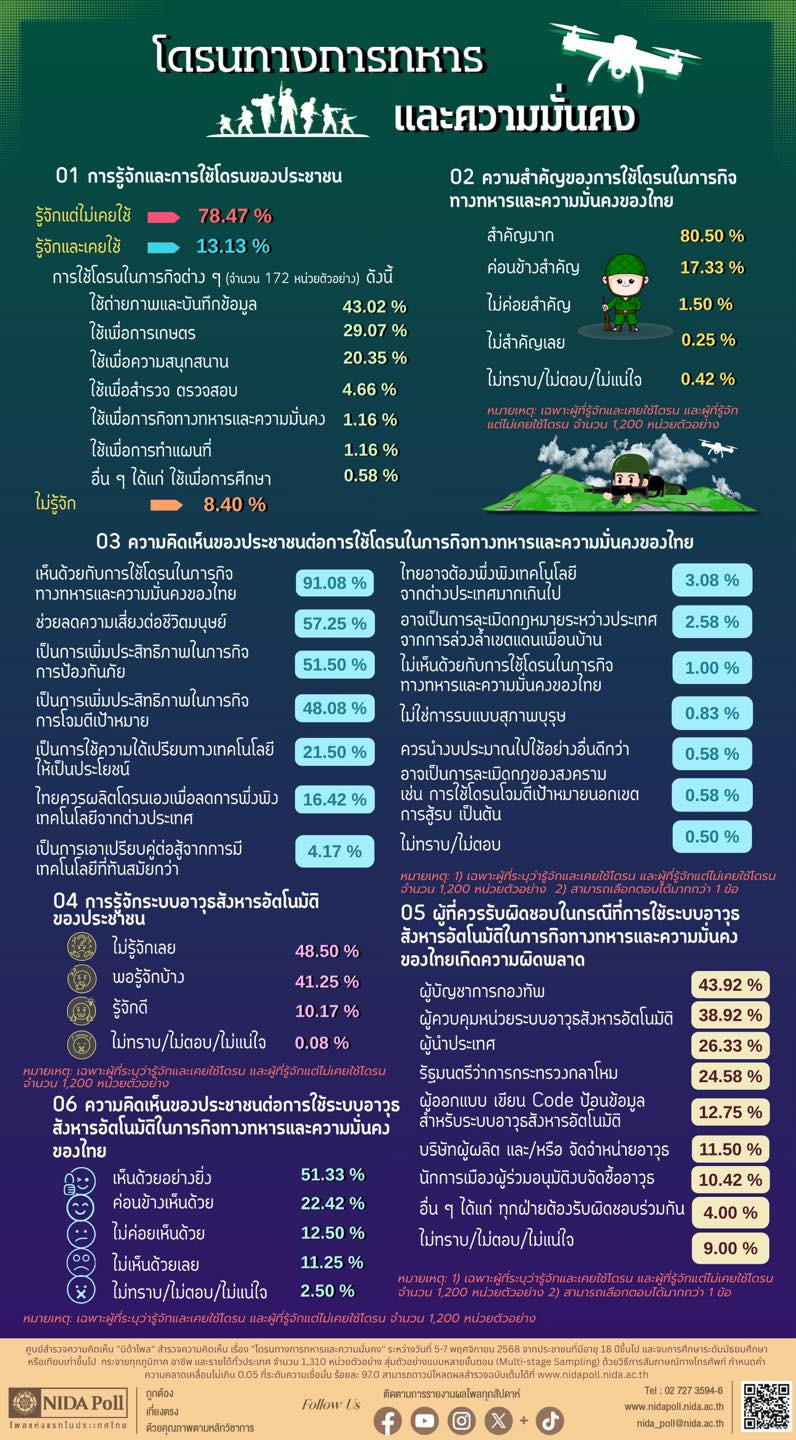 วันที่ 12 พ.ย.68 มีรายงานว่า ศูนย์สำรวจความคิดเห็น “นิด้าโพล” สถาบันบัณฑิตพัฒนบริหารศาสตร์ (นิด้า) เปิดเผยผลการสำรวจ เรื่อง “โดรนทางการทหารและความมั่นคง” ทำการสำรวจระหว่างวันที่ 5-7 พฤศจิกายน 2568 จากประชาชนที่มีอายุ 18 ปีขึ้นไป และจบการศึกษาระดับมัธยมศึกษาหรือเทียบเท่าขึ้นไป กระจายทุกภูมิภาค อาชีพ และรายได้ทั่วประเทศ รวมจำนวนทั้งสิ้น 1,310 หน่วยตัวอย่าง เกี่ยวกับความคิดเห็นของประชาชนต่อการใช้โดรนในภารกิจทางทหารและความมั่นคงของไทย การสำรวจอาศัยการสุ่มตัวอย่างโดยใช้ความน่าจะเป็นจากบัญชีรายชื่อฐานข้อมูลตัวอย่างหลัก (Master Sample) ของ “นิด้าโพล” สุ่มตัวอย่างแบบหลายขั้นตอน (Multi-stage Sampling) เก็บข้อมูลด้วยวิธีการสัมภาษณ์ทางโทรศัพท์ โดยกำหนดค่าความคลาดเคลื่อนไม่เกิน 0.05 ที่ระดับความเชื่อมั่น ร้อยละ 97.0
