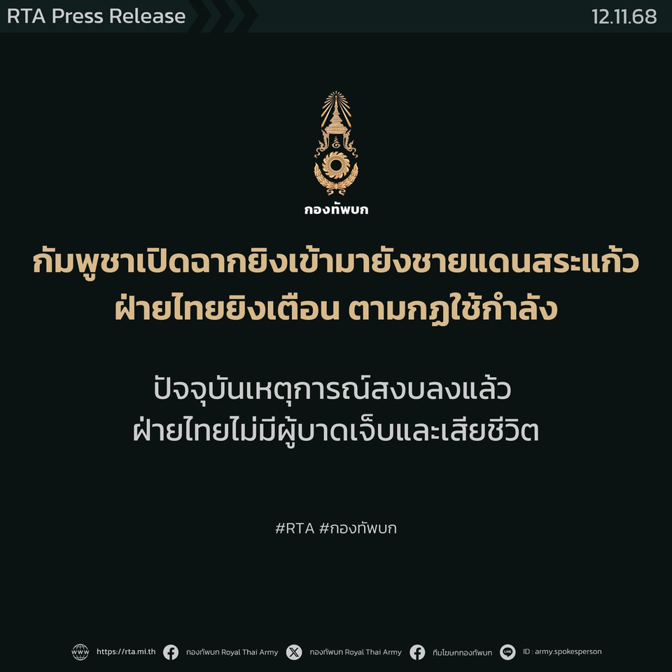 “โฆษก ทบ.” ยืนยัน! ทหารกัมพูชายิงก่อน ฝ่ายไทยตอบโต้ตามกฎการใช้กำลัง ไม่มีทหารไทยบาดเจ็บ