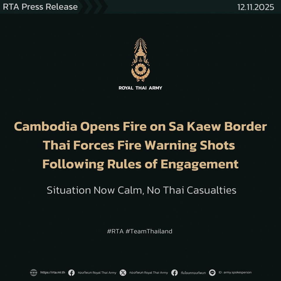 เมื่อวันที่ 12 พฤศจิกาน พล.ต.วินธัย สุวารี โฆษกกองทัพบก เปิดเผยว่า เมื่อเวลา 16.00 น. ศูนย์ปฏิบัติการกองทัพบกได้รับรายงานจากกองกำลังบูรพาว่า เกิดเหตุทหารกัมพูชาใช้อาวุธปืนยิงเข้ามายังฝั่งไทย ในพื้นที่ชายแดนบ้านหนองหญ้าแก้ว อำเภอโคกสูง จังหวัดสระแก้ว
