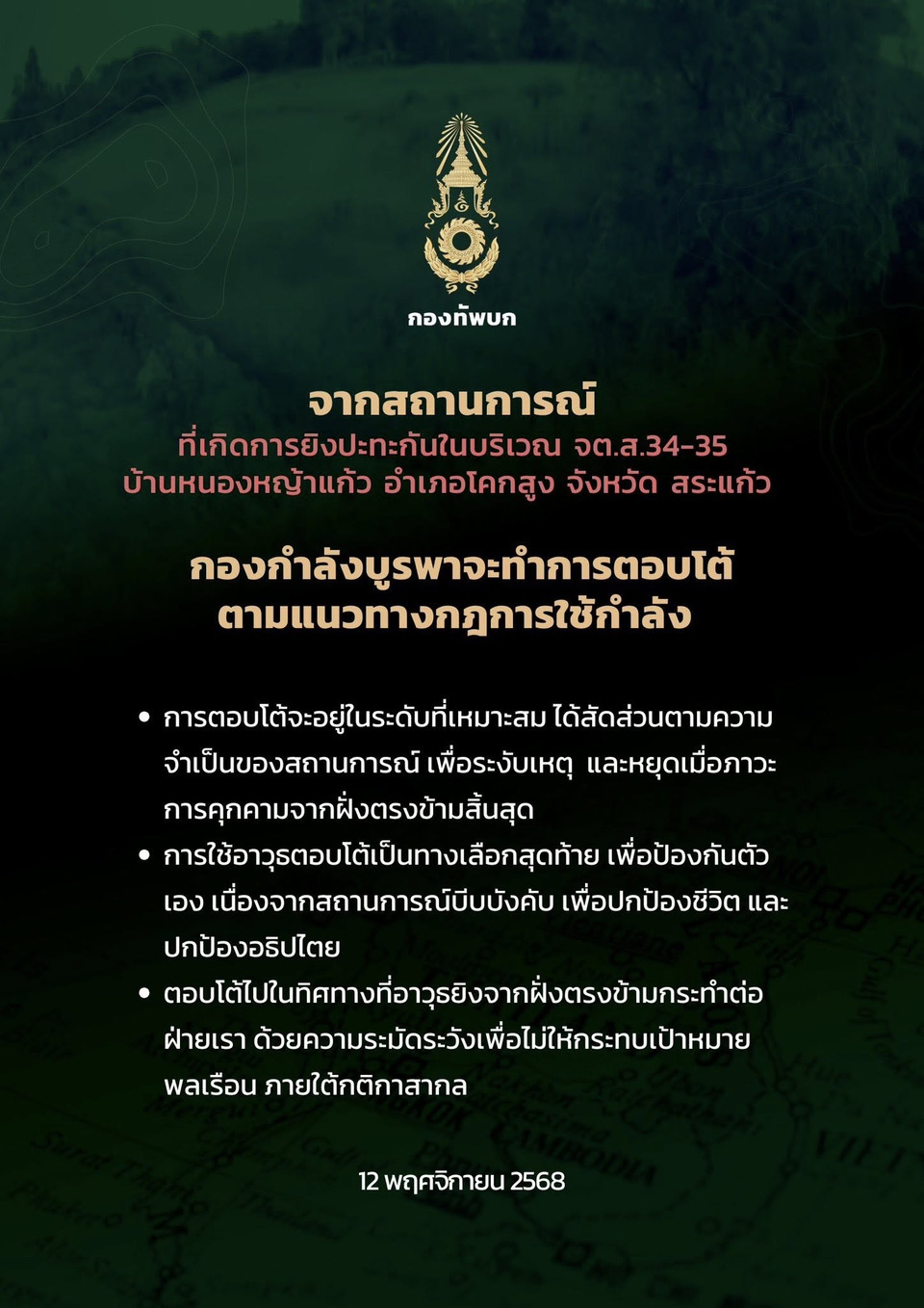 วันที่ 12 พ.ย.2568 เพจกองทัพบก โพสต์ข้อความระบุว่า จากสถานการณ์ที่เกิดการยิงปะทะกันในบริเวณ จต.ส.34-35 บ้านหนองหญ้าแก้ว อำเภอโคกสูง จังหวัด สระแก้ว