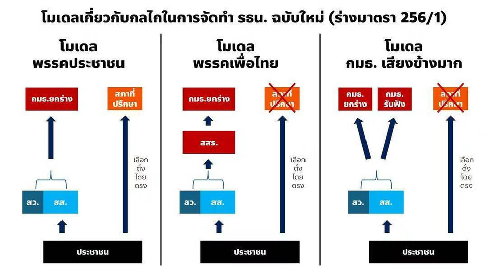 โดยกลไกแรกจะเป็นการเลือกกรรมาธิการ(กมธ.)ยกร่าง ซึ่งจะมาจากสมาชิกรัฐสภา ซึ่งที่ประชุมกมธ.ฯมีมติเสียงข้างมากเห็นชอบ ขณะที่ของพรรคเพื่อไทยมีการเสนอ ส.ส.ร. เข้ามาคั่นกลาง ก่อนเลือก กมธ.ยกร่าง ซึ่งมองว่าเป็น ส.ส.ร. ที่ไม่ได้มาจากการเลือกตั้งของประชาชนโดยตรง เราจึงเห็นว่าควรคงไว้ตามร่างเดิมของพรรคประชาชน เพราะการเพิ่ม ส.ส.ร. ที่ไม่ได้มาจากประชาชนเลือกตั้งโดยตรง อาจทำให้ผู้ร่างกับประชาชน มีระยะห่างมากขึ้น และกังวลว่าการเพิ่มส.ส.ร. ที่ไม่ได้มาจากการเลือกตั้งของประชาชน อาจทำให้ กมธ. ยกร่างฯ ถูกผูกขาดจากฝ่ายใดฝ่ายหนึ่ง หรือสีใดสีหนึ่ง