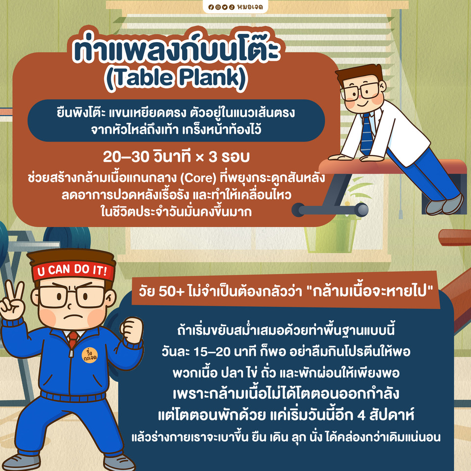 5.ท่าแพลงก์บนโต๊ะ (Table Plank) ท่านี้ให้เริ่มจากยืนพิงโต๊ะ แขนเหยียดตรง ตัวอยู่ในแนวเส้นตรงจากหัวไหล่ถึงเท้า เกร็งหน้าท้องไว้ 20–30 วินาที × 3 รอบ ช่วยสร้างกล้ามเนื้อแกนกลาง (Core) ที่พยุงกระดูกสันหลัง ลดอาการปวดหลังเรื้อรัง และทำให้เคลื่อนไหวในชีวิตประจำวันมั่นคงขึ้นมากครับ