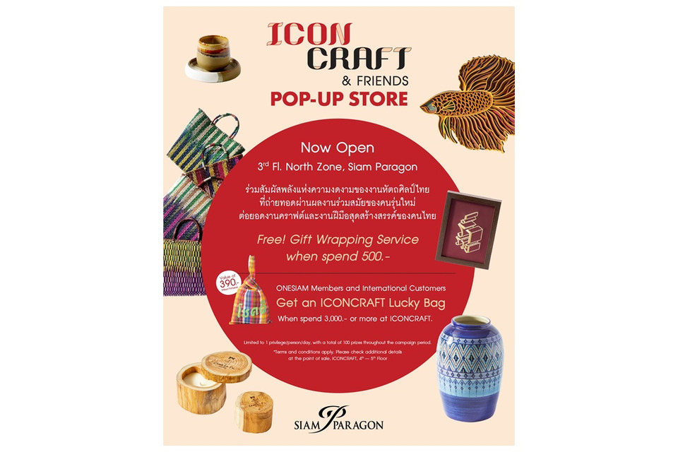 ไอคอนคราฟต์ (ICONCRAFT) พื้นที่แห่งแรงบันดาลใจ แหล่งรวมงานคราฟต์สร้างสรรค์จากช่างฝีมือไทยที่ใหญ่ที่สุด สานต่อความตั้งใจในการผลักดัน Local Heroes สู่ Global Heroes ส่งเสริมงานหัตถกรรมไทยร่วมสมัยให้กาวสู่ตลาดสากล ขยายแรงบันดาลใจแห่งงานฝีมือไทยสู่พื้นที่ใหม่ เปิด Pop-up Store ภายใต้คอนเซ็ปต์ “ICONCRAFT & FRIENDS” พื้นที่ที่ความคิดสร้างสรรค์มาบรรจบกับความเอื้อเฟื้อ นำแบรนด์คราฟต์จากทั่วประเทศ มาเผยเสน่ห์หัตถศิลป์ไทยในมุมมองร่วมสมัยสู่สายตาโลก ณ ชั้น 3 สยามพารากอน