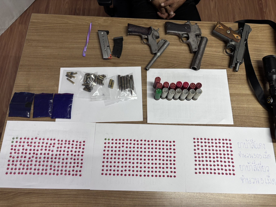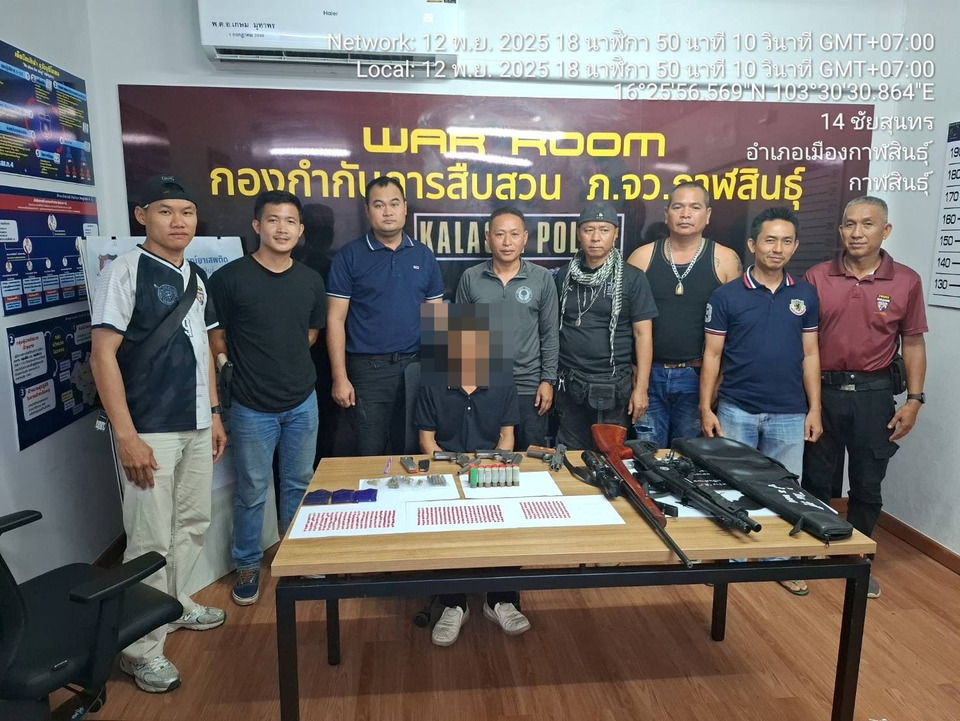วันที่ 13 พฤศจิกายน 2568 พ.ต.อ.นพวิทย์ ดิษฐาธนาธรสิริ ผกก.สืบสวน.ภ.จว.กาฬสินธุ์ เปิดเผยว่า เมื่อวันที่ 12 พฤศจิกายน ที่ผ่านมา ภายใต้การอำนวยการโดย พล.ต.ต.ทรงพล บริบาลประสิทธิ์ ผบก.ภ.จว.กาฬสินธุ์ , พ.ต.อ.นพดล ศรีชะตา รอง ผบก.ภ.จว.กาฬสินธุ์ ,พ.ต.อ.ขจรฤทธิ์ วงศ์ราช รอง ผบก.ภ.จว.กาฬสินธุ์,พ.ต.อ.นพวิทย์ ดิษฐาธนาธรสิริ ผกก.สืบสวน.ภ.จว.กาฬสินธุ์ พร้อมด้วยชุดจับกุม กก.สส.ภ.จว.กาฬสินธุ์ นำโดยพ.ต.ท.ชาตรี แก้วเบ้า สว.กก.สส.ภ.จว.กาฬสินธุ์, ร.ต.อ.วัชรินทร์ นิสังกาศ รอง สว.กก.สส.ฯ ,ร.ต.อ.พิชิต โยธานันท์ รองสว.กก.สส.ฯ พร้อมชุดสืบสวน ภ.จว.กาฬสินธุ์ ร่วมกันจับกุมตัวนายกิตติภพ หรือโอ๋ (สงวนนามสกุล) อายุ 47 ปี ภูมิลำเนาอยู่ ม.9 ต.ลำพาน อ.เมือง จ.กาฬสินธุ์ ซึ่งมีตำแหน่งเป็นเจ้าพนักงานธุรการชำนาญงาน อบต.สามขา อ.กุฉินารายณ์ จ.กาฬสินธุ์ พร้อมของกลางยาบ้า 510 เม็ด, อาวุธปืนลูกซองยาว 1 กระบอก, ปืนยาวขนาด .22 จำนวน 1 กระบอก, ปืนพกสั้นแบบไทยประดิษฐ์ใช้กับกระสุนขนาด 9 มม. 1 กระบอก, ปืนพกสั้นแบบไทยประดิษฐ์ใช้กับกระสุนขนาด .380 มม. 1 กระบอก, ปืนลูกซองไทยประดิษฐ์ใช้กับกระสุนลูกซองขนาดเบอร์ 12 จำนวน 1 กระบอก, ซองบรรจุกระสุนขนาด 9 มม. 1 อัน, ซองบรรจุกระสุนขนาด .22 จำนวน 1 อัน, กระสุนลูกซองเบอร์ 12 จำนวน 15 นัด, กระสุนขนาด 5.56 จำนวน 10 นัด, กระสุนปืนขนาด .22 จำนวน 5 นัด,กระสุนปืนขนาด .25 จำนวน 8 นัด, กระสุนปืนขนาด .38 จำนวน 2 นัด, และกระสุนปืนขนาด 9 มม.อีกจำนวน 10 นัด