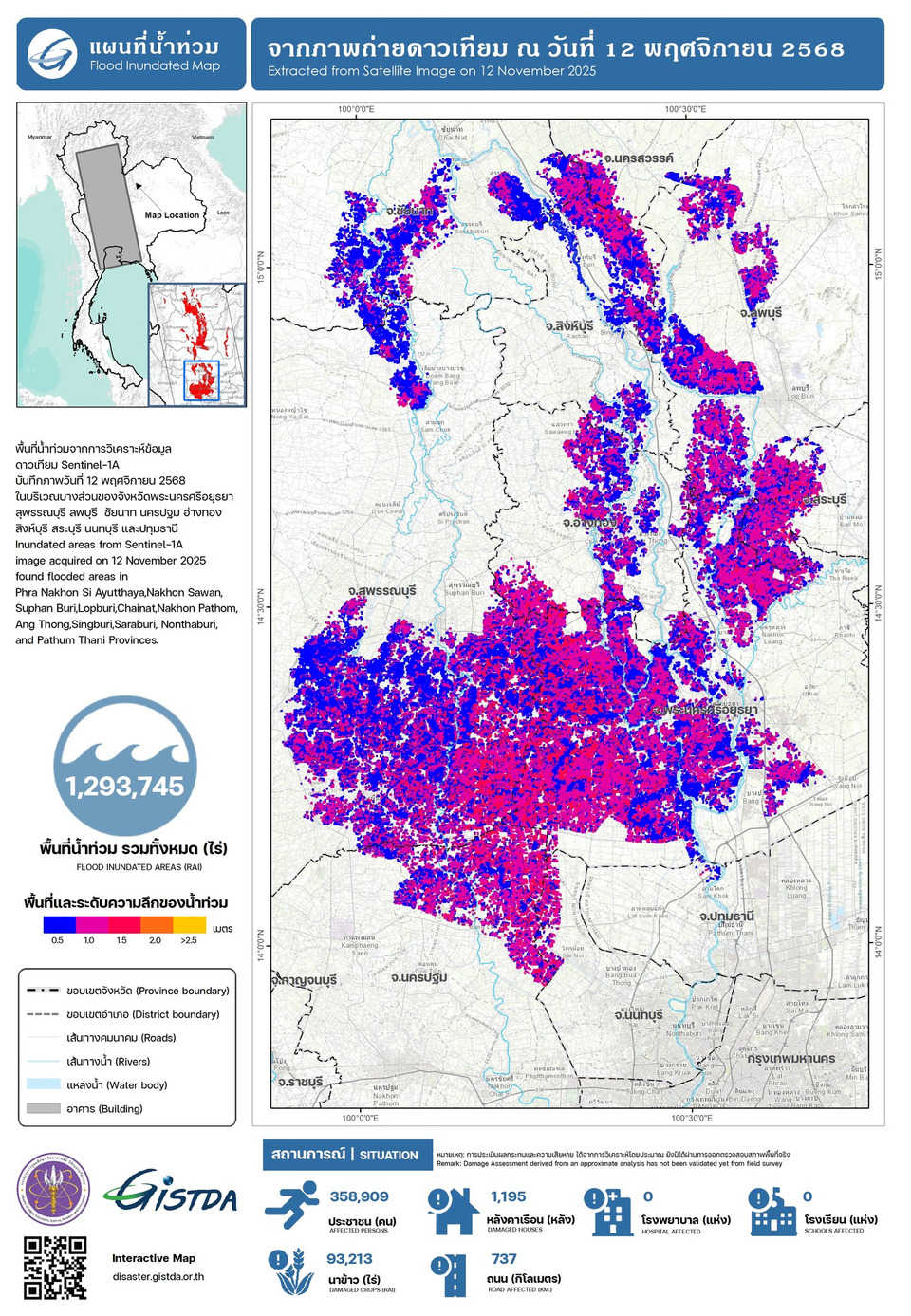 สำนักงานพัฒนาเทคโนโลยีอวกาศและภูมิสารสนเทศ (องค์การมหาชน) หรือ สทอภ. (GISTDA เปิดข้อมูลล่าสุดจากดาวเทียม Sentinel-1A ของวันที่ 12 พฤศจิกายน 2568 พบพื้นที่น้ำท่วมขังในพื้นที่ลุ่มและที่อยู่อาศัยบริเวณบางส่วนของ 10 จังหวัดภาคกลาง ได้แก่ พระนครศรีอยุธยา สุพรรณบุรี ลพบุรี นครปฐม ชัยนาท อ่างทอง สิงห์บุรี สระบุรี นนทบุรี และปทุมธานี ประมาณ 1,293,745 ไร่ โดยแต่ละพื้นที่พบระดับความลึกของน้ำท่วมขังส่วนใหญ่ไม่น้อยกว่า 1 เมตร สำหรับพื้นที่ที่ได้รับผลกระทบหลักๆ ส่วนใหญ่เป็นพื้นที่เกษตรกรรม ชุมชนที่อยู่อาศัยตามแนวริมแม่น้ำสายหลักและสายรอง รวมถึงเส้นทางคมนาคมสำคัญบางส่วน