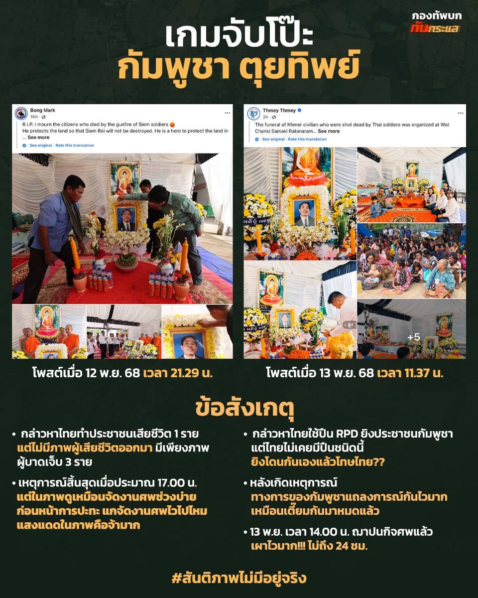 วันที่ 13 พ.ย.2568 เพจเฟซบุก "กองทัพบก ทันกระแส" โพสต์ข้อความระบุว่า " เกมจับโป๊ะ กัมพูชา ตุยทิพย์" พร้อมภาพประกอบเพื่ออธิบายกรณีที่ฝั่งกัมพูชากล่าวหาว่าทหารไทยทำชาวบ้านกัมพูชาได้รับบาดเจ็บ และเสียชีวิต รวมถึงการกล่าวหาว่าไทยใช้ปืน RPD ทั้งที่ไทยไม่มีปืนชนิดนี้ใช้