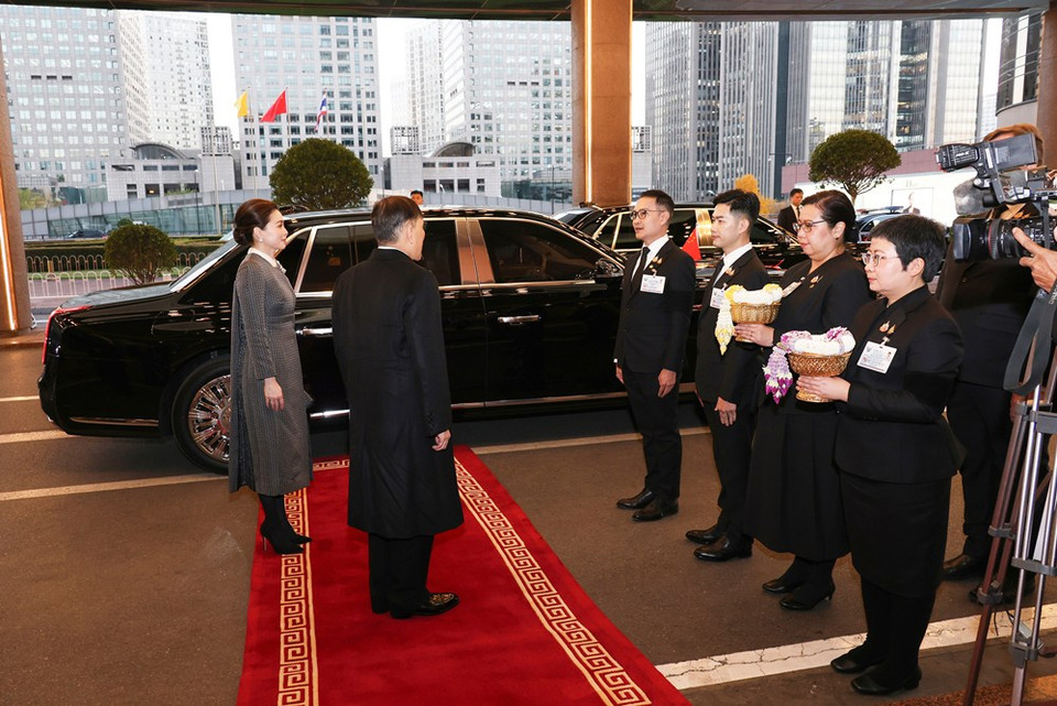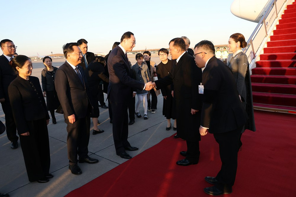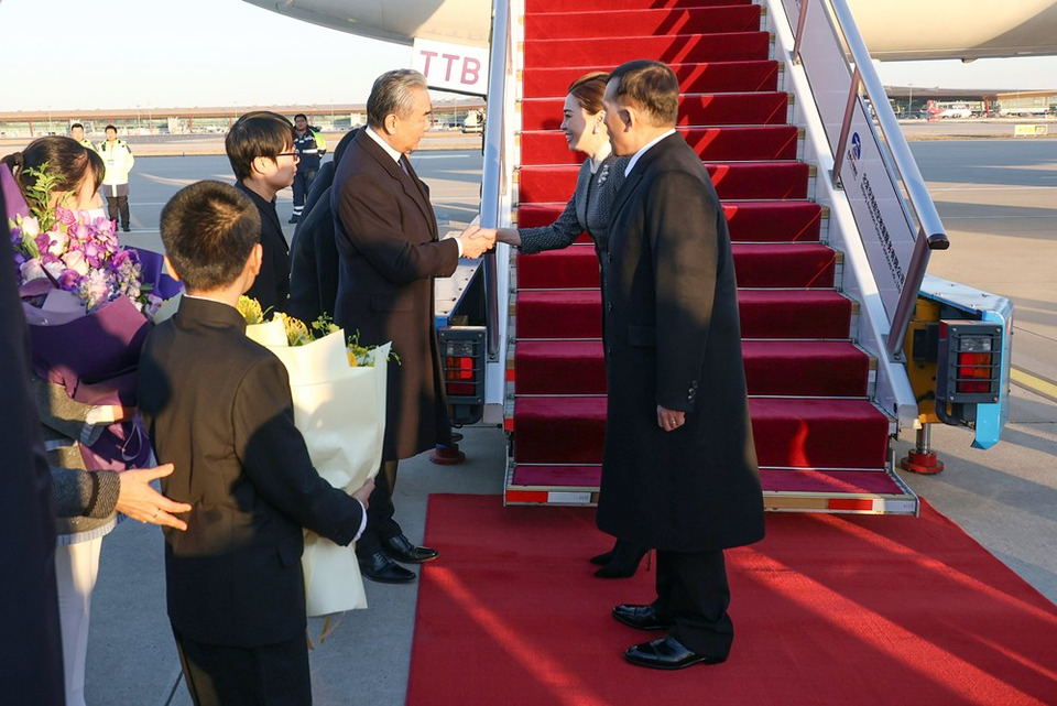 นายหวัง อี้ (Mr. Wang Yi) สมาชิกกรมการเมือง ผู้อำนวยการสำนักงานคณะกรรมการกลางด้านกิจการต่างประเทศของพรรคคอมมิวนิสต์จีน และรัฐมนตรีว่าการกระทรวงการต่างประเทศ สาธารณรัฐประชาชนจีน พร้อมด้วยข้าราชการระดับสูง สาธารณรัฐประชาชนจีน เฝ้าทูลละอองธุลีพระบาทรับเสด็จ ในโอกาสนี้ เด็กชายชาวจีนทูลเกล้าทูลกระหม่อมถวายช่อดอกไม้แด่พระบาทสมเด็จพระเจ้าอยู่หัว และเด็กหญิงชาวจีนทูลเกล้าทูลกระหม่อมถวายช่อดอกไม้แด่สมเด็จพระนางเจ้า ฯ พระบรมราชินี เสร็จแล้ว ทรงพระดำเนินผ่านแถวกองทหารเกียรติยศ เสร็จแล้ว นายหวัง อี้ (Mr. Wang Yi) สมาชิกกรมการเมือง ฯ และรัฐมนตรีว่าการกระทรวงการต่างประเทศสาธารณรัฐประชาชนจีน ส่งเสด็จ จากนั้น พระบาทสมเด็จพระเจ้าอยู่หัว และสมเด็จพระนางเจ้า ฯ พระบรมราชินี ประทับรถยนต์พระที่นั่ง เสด็จพระราชดำเนินไปยังโรงแรมไชนาเวิลด์ กรุงปักกิ่ง (China World Hotel, Beijing) ซึ่งสาธารณรัฐประชาชนจีนจัดถวายเป็นที่ประทับแรม