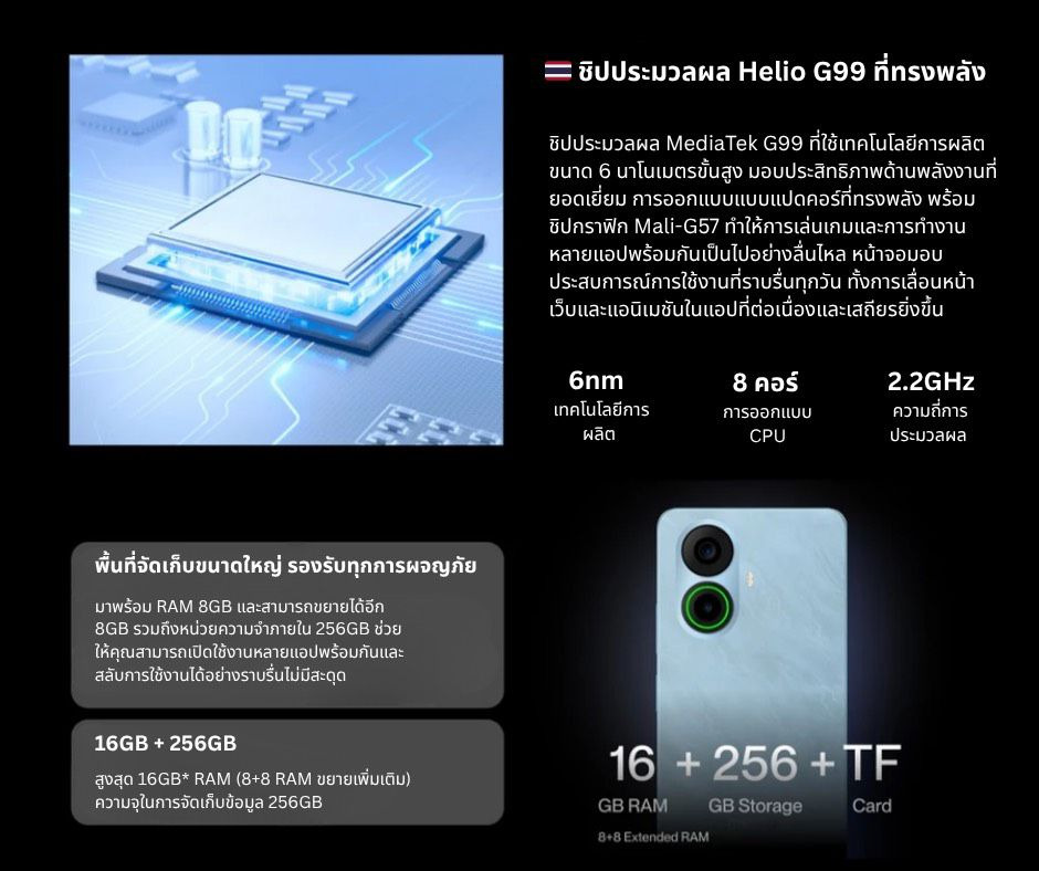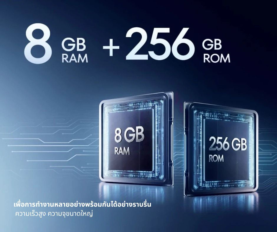 ด้านกล้อง มาพร้อมกล้องหลังคู่ 64MP + 2MP และกล้องหน้า 13MP ที่ถ่ายภาพได้คมชัดและเป็นธรรมชาติ แบตเตอรี่ขนาด 4950mAh รองรับการชาร์จเร็ว 30W Fast Charge ใช้งานได้ยาวนาน ดีไซน์ฝาหลังลวดลายหินอ่อนเพิ่มความหรูหราและเอกลักษณ์ หน่วยความจำ RAM 8GB และ ROM 256GB (UFS 2.2) รองรับ สองซิม 4G ให้ประสบการณ์ใช้งานที่ลื่นไหลและสะดวกสบาย