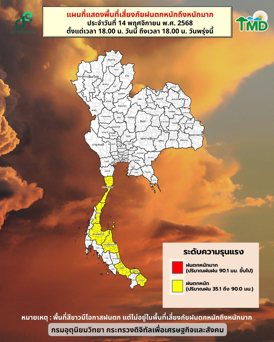 เมื่อวันที่ 14 พ.ย.68 กรมอุตุนิยมวิทยา เผยแพร่กราฟิกพยากรณ์อากาศประจำวันที่ 14 พฤศจิกายน 2568 เวลา 18.00 น. ระบุว่าประเทศไทยยังคงเผชิญสภาพอากาศแปรปรวนหลายพื้นที่ โดยเฉพาะ ภาคใต้ฝั่งอันดามันและอ่าวไทย ที่มีโอกาสเกิด ฝนฟ้าคะนองและฝนตกหนักถึงหนักมาก 60% ของพื้นที่ พร้อมฝนลมแรงบางแห่ง