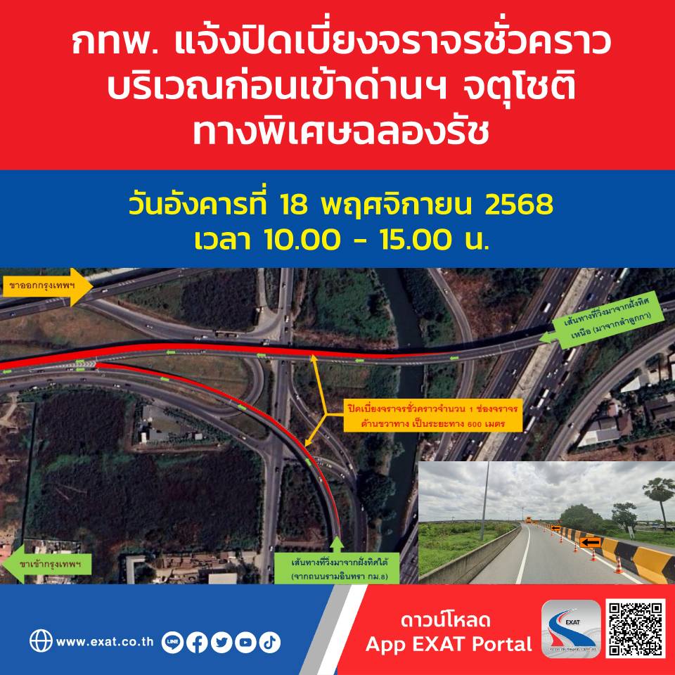 การทางพิเศษแห่งประเทศไทย (กทพ.) กระทรวงคมนาคม ได้ว่าจ้าง บริษัท อิตาเลียนไทย ดีเวล๊อปเมนต์ จำกัด (มหาชน) เพื่อดำเนินงานก่อสร้างโครงการทางพิเศษฉลองรัชส่วนต่อขยาย (ช่วงจตุโชติ-ถนนลำลูกกา) (งานโยธา) โดยบริษัทฯ จะเข้าดำเนินงานดังกล่าว จึงมีความจำเป็นจะต้องปิดเบี่ยงจราจรชั่วคราว บริเวณก่อนเข้าด่านเก็บค่าผ่านทางพิเศษจตุโชติ ทางพิเศษฉลองรัช ในวันอังคารที่ 18 พฤศจิกายน 2568 ช่วงเวลา 10.00 - 15.00 น. เพื่อดำเนินการติดตั้งป้ายจราจรเตือนงานก่อสร้างบนกำแพงกันตก (Parapet) ของทางพิเศษสายรามอินทรา-วงแหวนรอบนอกกรุงเทพมหานคร จำนวน 6 ตำแหน่ง ดังนี้