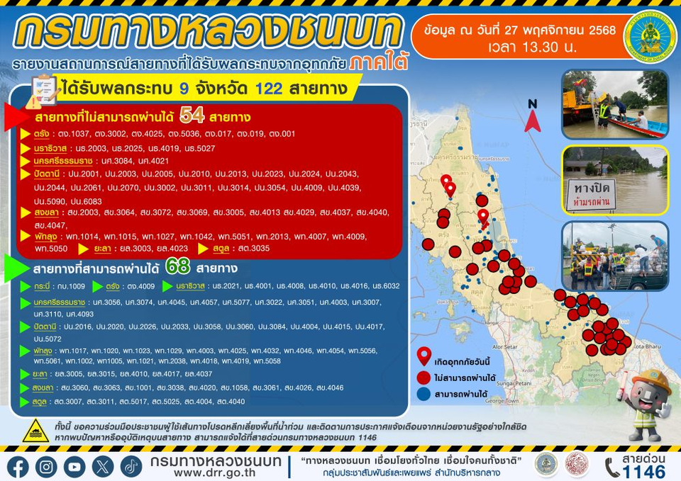 ทั้งนี้หากประชาชนต้องการแจ้งเหตุอุทกภัยและขอความช่วยเหลือสามารถติดต่อได้ที่สายด่วนกรมทางหลวงชนบท 1146